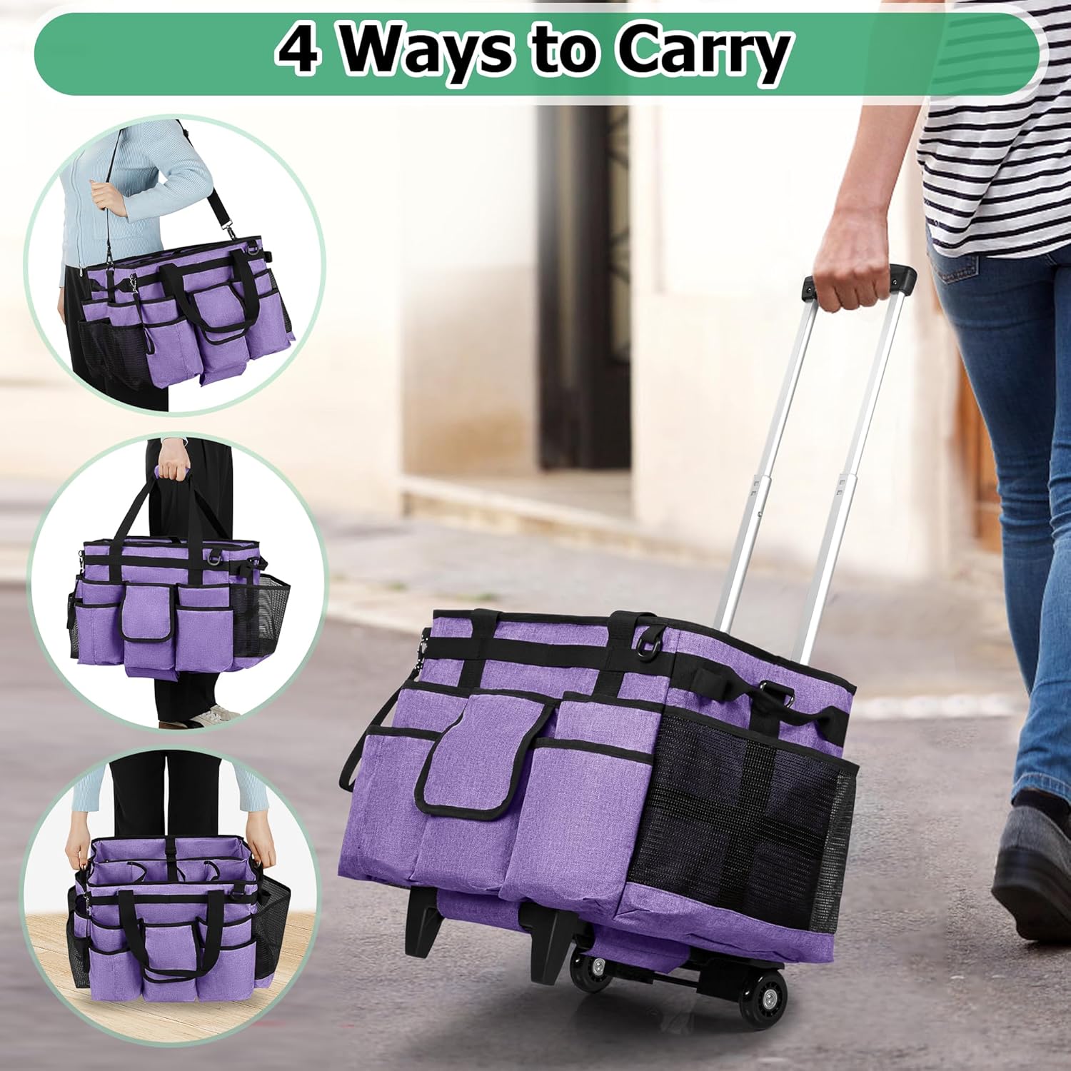 LoDrid Rolling Cleaning Bag with Detachable Trolley, Professional Cleaning Caddy with Shoulder Strap for Housekeepers, Portable Cart on Wheels for Supplies, Purple (Patent Design)