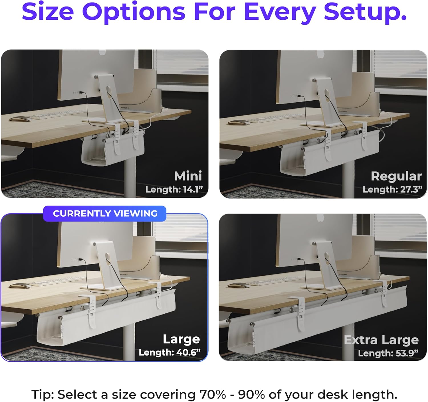 - DESK WIRE MANAGEMENT MADE EASY: Tidy up with our under desk cord organizer. Supports up to 66lbs with sizing options from Mini (14") to XL (54"), standing desks, and workstations. Ideal computer cable organizer desk for home or office.