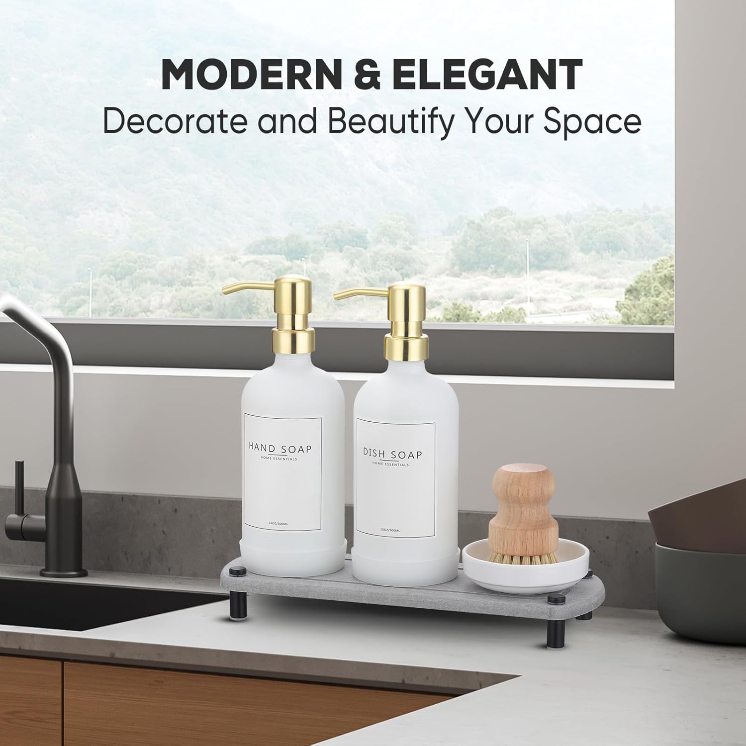 - KITCHEN SOAP DISPENSER SET INCLUDES:2Pcs white glass soap dispenser with gold stainless steel pump for kitchen sink,a instant stone drying sink tray,a Bamboo dish brush with tray,12pcs waterproof labels,2pcs non-slip silicone pads&foldable funnel.Both practical and elegant, the luxury soap dispenser set is the perfect kitchen and bathroom counter decor
