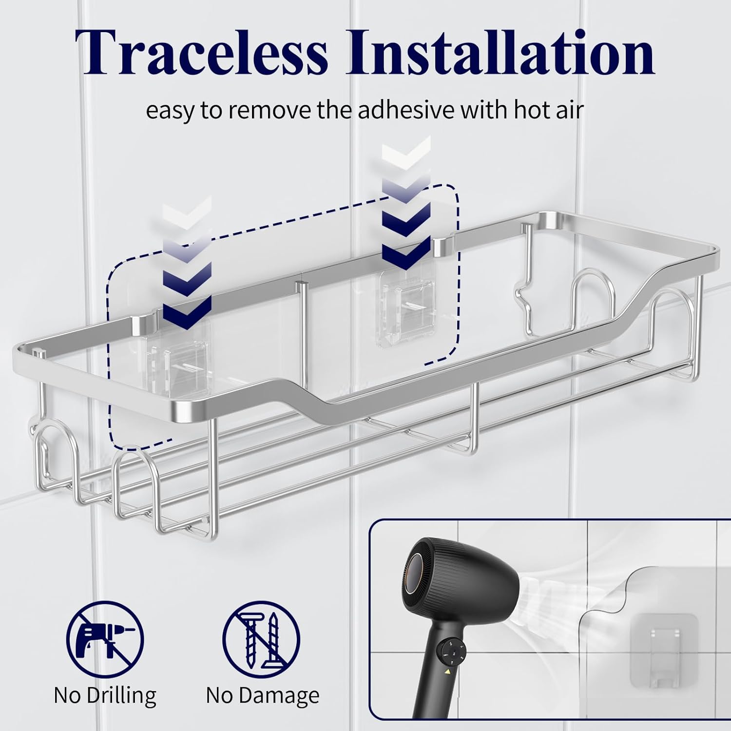 - EASY TO INSTALL: Installing a Kitsure bathroom shower organizer is a breeze for no drilling is required. The removable adhesive tapes leave no traces or damage on the wall. In addition, the full mesh design allows efficient water drainage and prevents water accumulation, ensuring the bath essentials dry quickly.