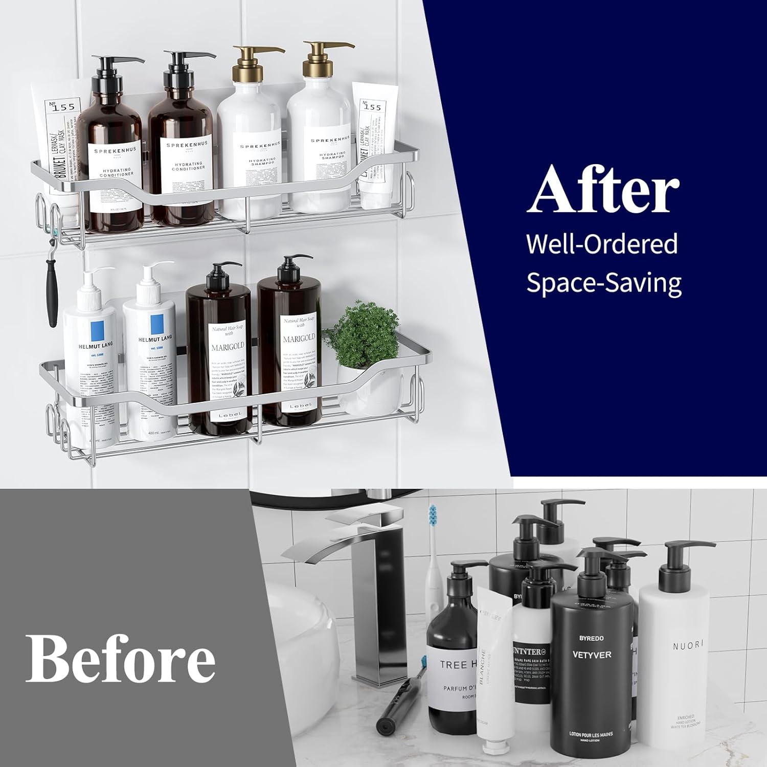 - AMPLE STORAGE CAPACITY: With dimensions of 11.4"x4.0"x2.1" and 11.0"x3.7"x1.9", Kitsure 2-pack shower shelves aim to help you efficiently organize your bathroom essentials. Moreover, the built-in 8 hooks allow you to hang any small item, such as razors, towels, bath brushes, shower loofahs, etc.