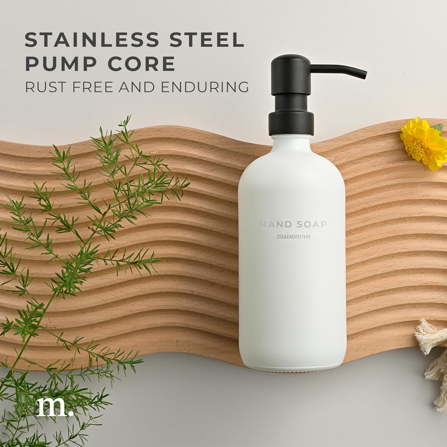 - This Pack Includes: A 16.9 Oz/500ml white glass soap dispenser with pump, the liquid dispenser is refillable and versatile. It boasts a sleek design with a black stainless steel pump dispenser and comes with a set of decal mix labels.
