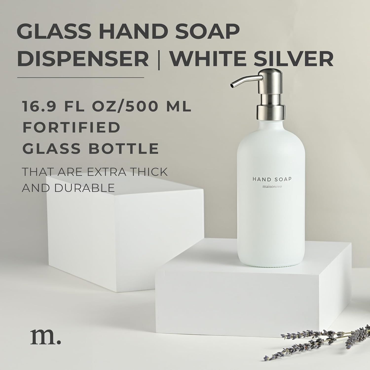 - This Pack Includes: A 16.9 Oz/500ml white glass soap dispenser with pump, the liquid dispenser is refillable and versatile. It boasts a sleek design with a silver stainless steel pump dispenser and comes with a set of decal mix labels.