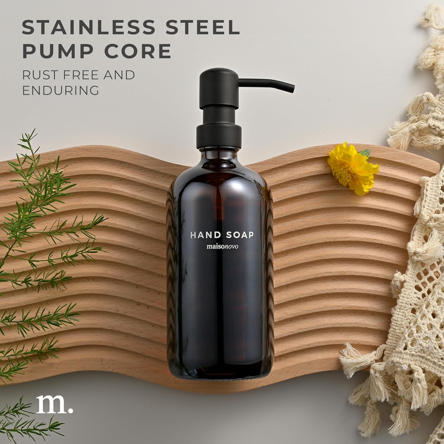 - This Pack Includes: A 16.9 Oz/500ml amber glass soap dispenser with pump, the liquid dispenser is refillable and versatile. It boasts a sleek design with a black stainless steel pump dispenser and comes with a set of decal mix labels.