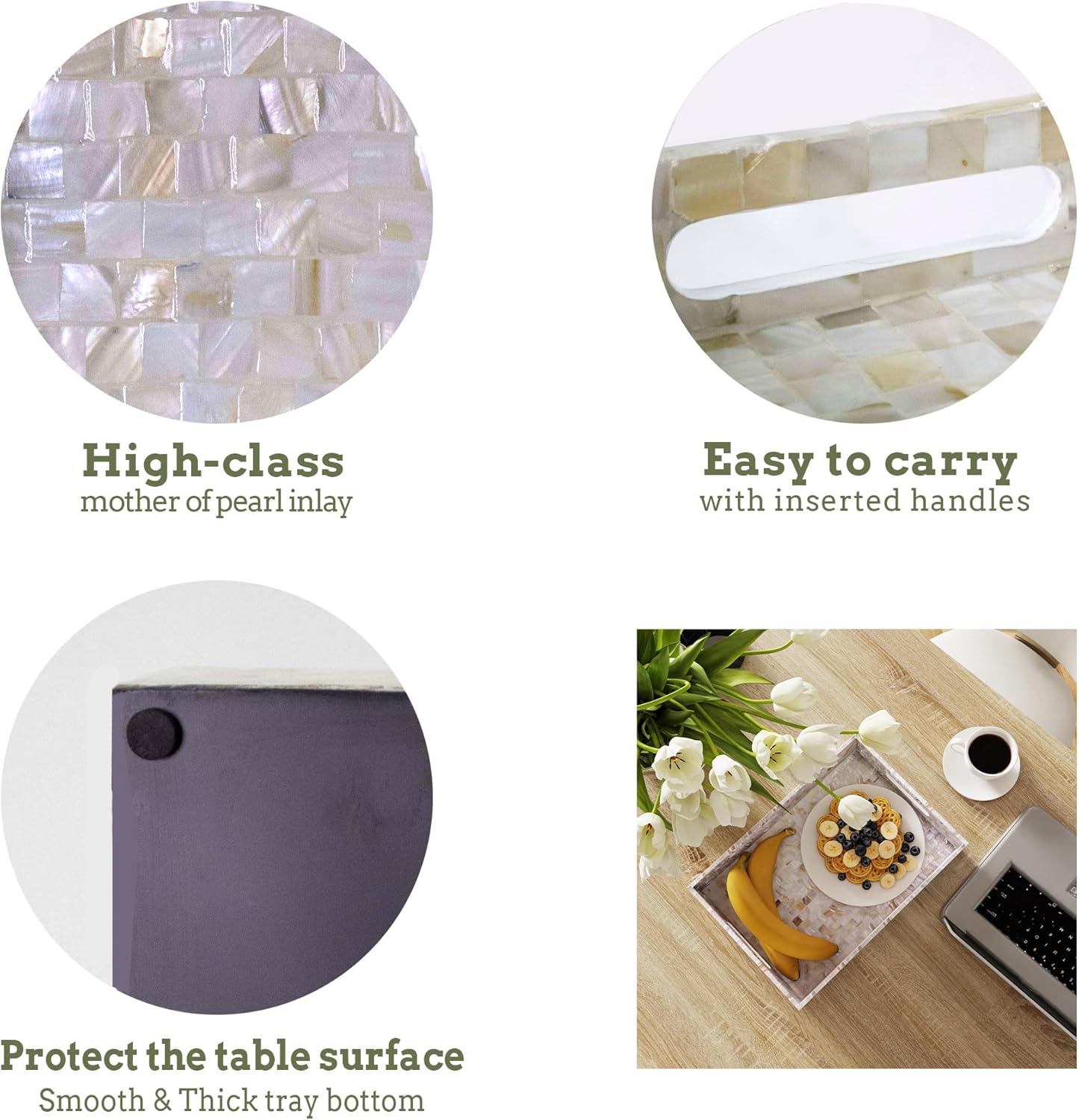 - [PREMIUM QUALITY] Our mother of pearl inlay serving, and coffee trays are handcrafted by Vietnamese artisans. It is light, made of wood and handmade to last a long time. The tray is designed with an inserted handle so it's easy to carry around. The bottom is covered with a soft, thick layer of paint so the tray leaves no scratches on the table surface during usage. Mother of pearls has long been the favorite luxury decorative material in Asia for centuries.