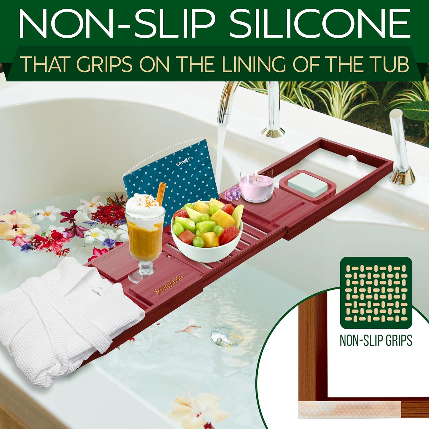 - EXTENDABLE AND ADJUSTABLE: SereneLife’s Bamboo Bathtub Caddy has an extendable and adjustable length to 27.5” to 40” inches with Slide-out arms, ideal for any tub. It also has removable trays for various bathroom accessories