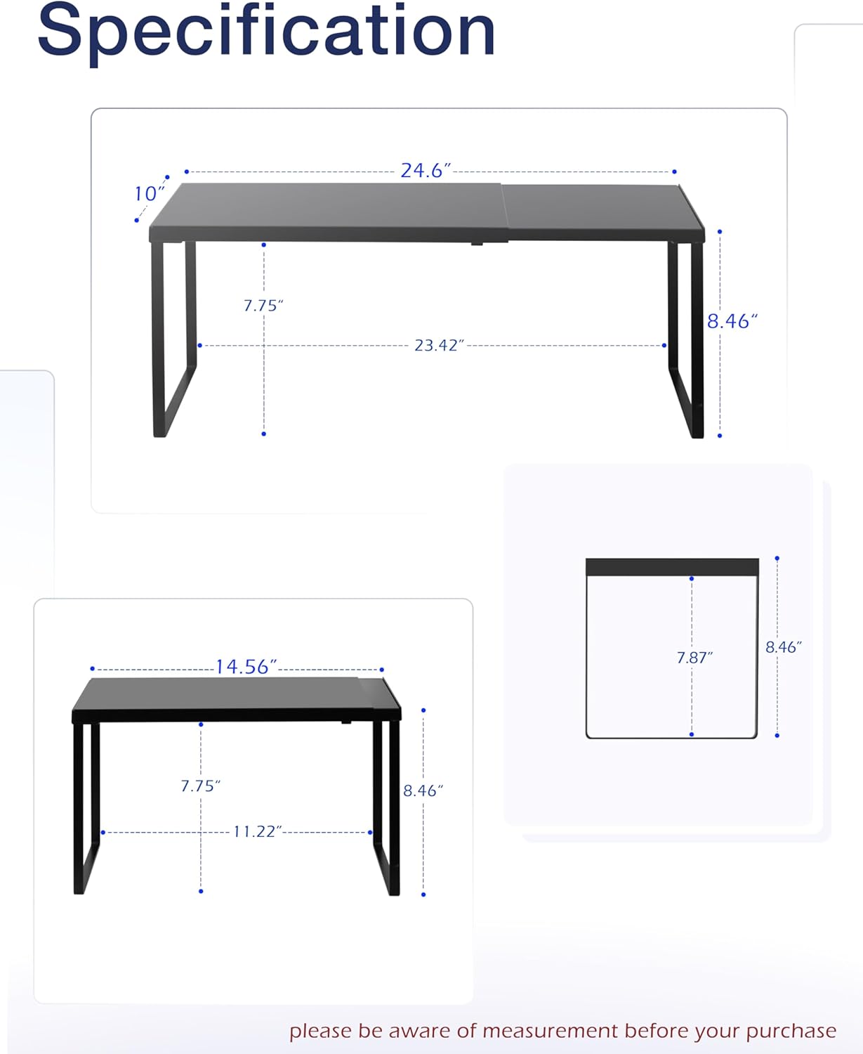 - SPECIFICATION: 10’’D * 14.56-24.6’’W * 8.46’’H. If you purchase 2 of these expandable shelves set you can stack one of top of another thereby creating a two-tier storage space. Easy to assemble with a clear manual.