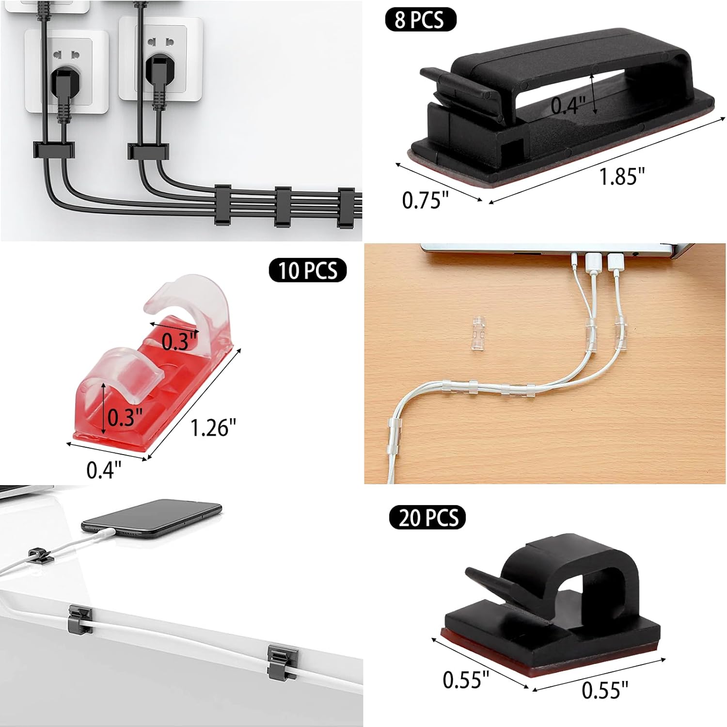 - Cable Management Kit - 4 Cable Sleeves+ 40 Reusable wire ties+ 38 Cable Clips+ 7 Cord Holders+ 5 Self Adhesive Cable Tie Rolls+ 10 Cable Zip Tie Mounts+ 200 Cable Fastening Ties+ 300 Wire clips with nails