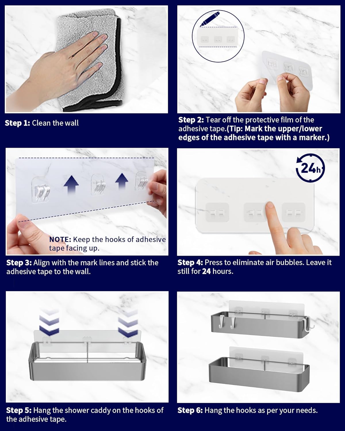 - DRILL-FREE INSTALLATION: Kitsure drill-free shower caddy is super easy to install without screws, gel, or any special tools, and it will not damage the wall at all. The adhesive tapes are removable. Just heat the surfaces with a hair dryer for 5 mins and peel them off. (NOTE: Please install the shower caddy on smooth and sturdy surfaces.)