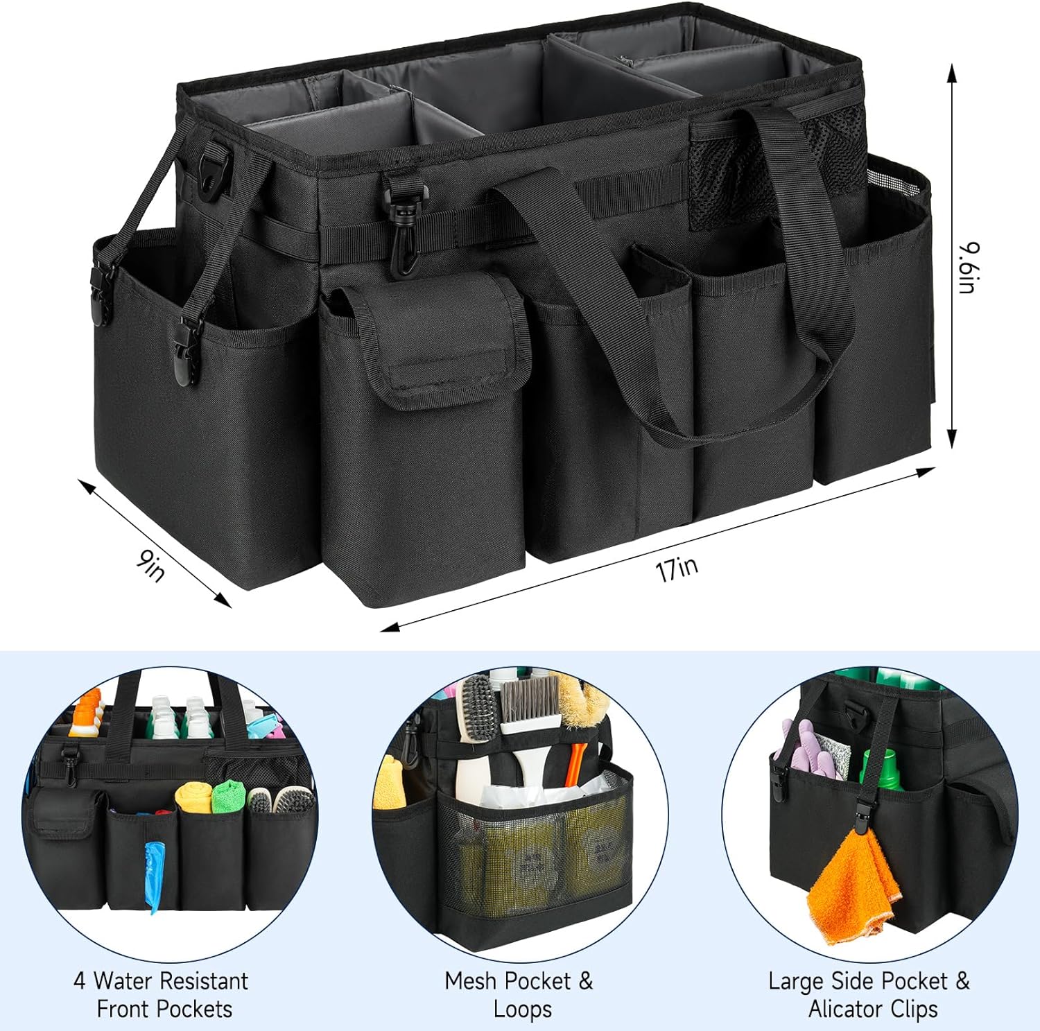 - Removable Padded Cushion: Unlike other fixed compartments, this cleaning caddy for cleaning supplies is designed with removable padded divider, which can help you use the space widely and make your items well-organized