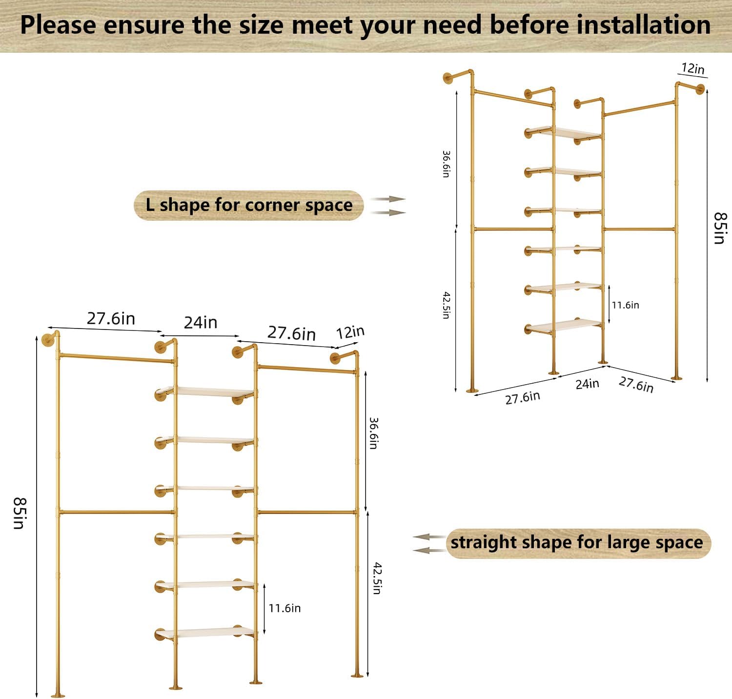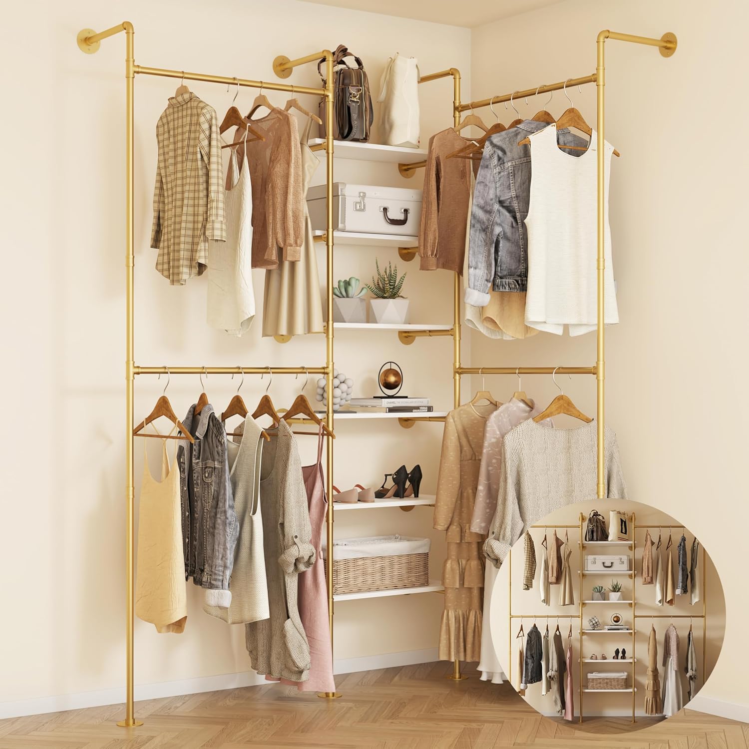 Industrial Pipe Clothes Rack, DÉCOR Wall Mounted Clothing Rack, for Walk-in Wardrobe Multi-Purpose Storage Clothes Hanging Shelf, 2 Installation Methods Gold