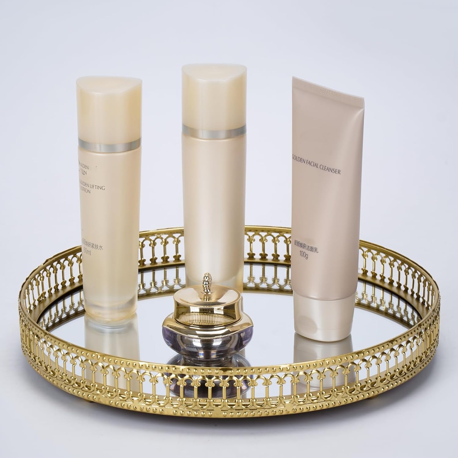 - Pretty Decorative Tray: Classical round shape, beautiful gold metal with exquisite hollow out pattern,mirrored glass surface design that adds stylish and elegant to your home decor;Made of sleek glass and metal,sturdy quality,keep your item organized