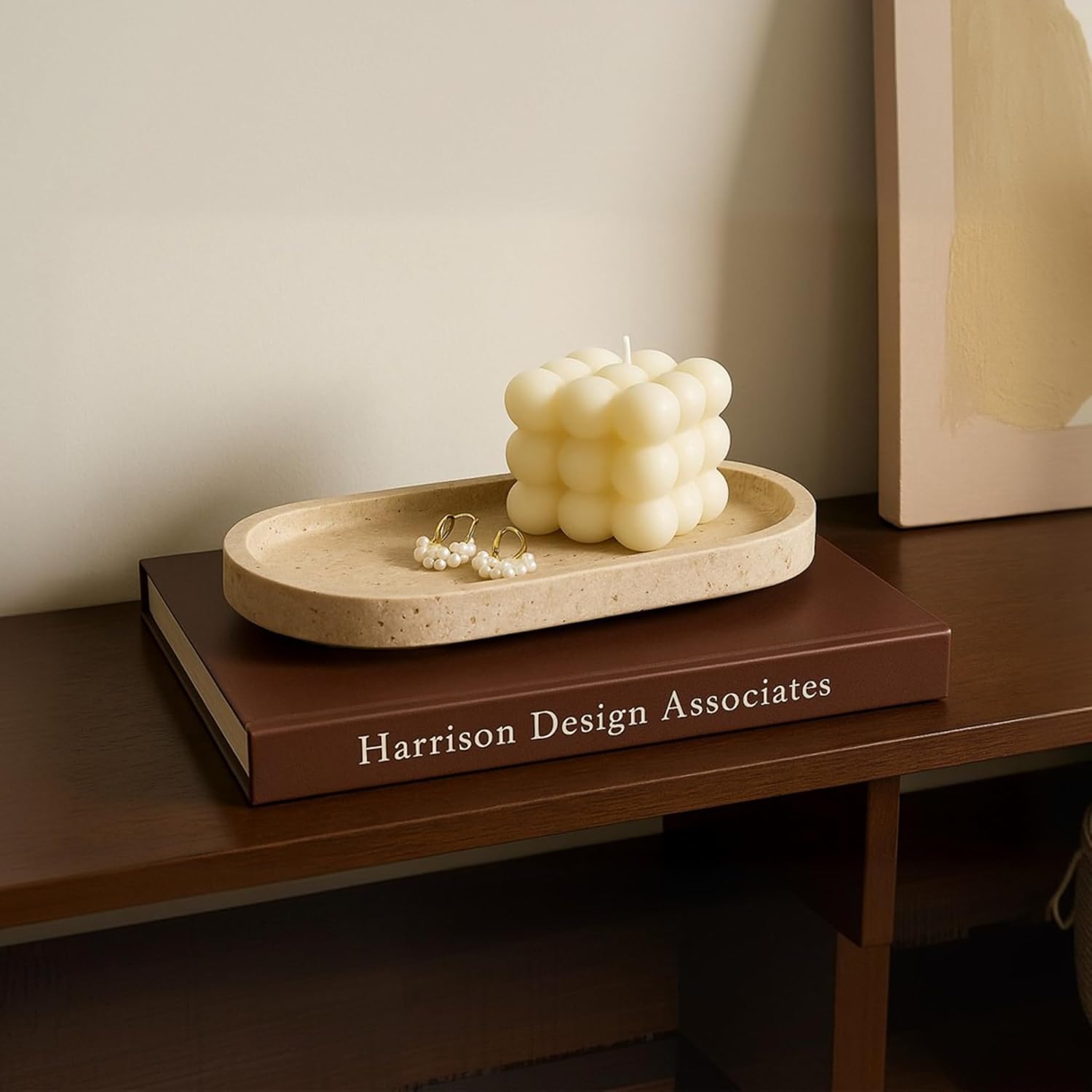 WORHE Italy Natural Travertine Stone Tray for Jewelry, Candles, Perfume, Trinket, Marble Oval Vanity Trays for Bathroom, Dresser, Kitchen, Countertop Storage Organizer for Home Decor Beige (WH028)