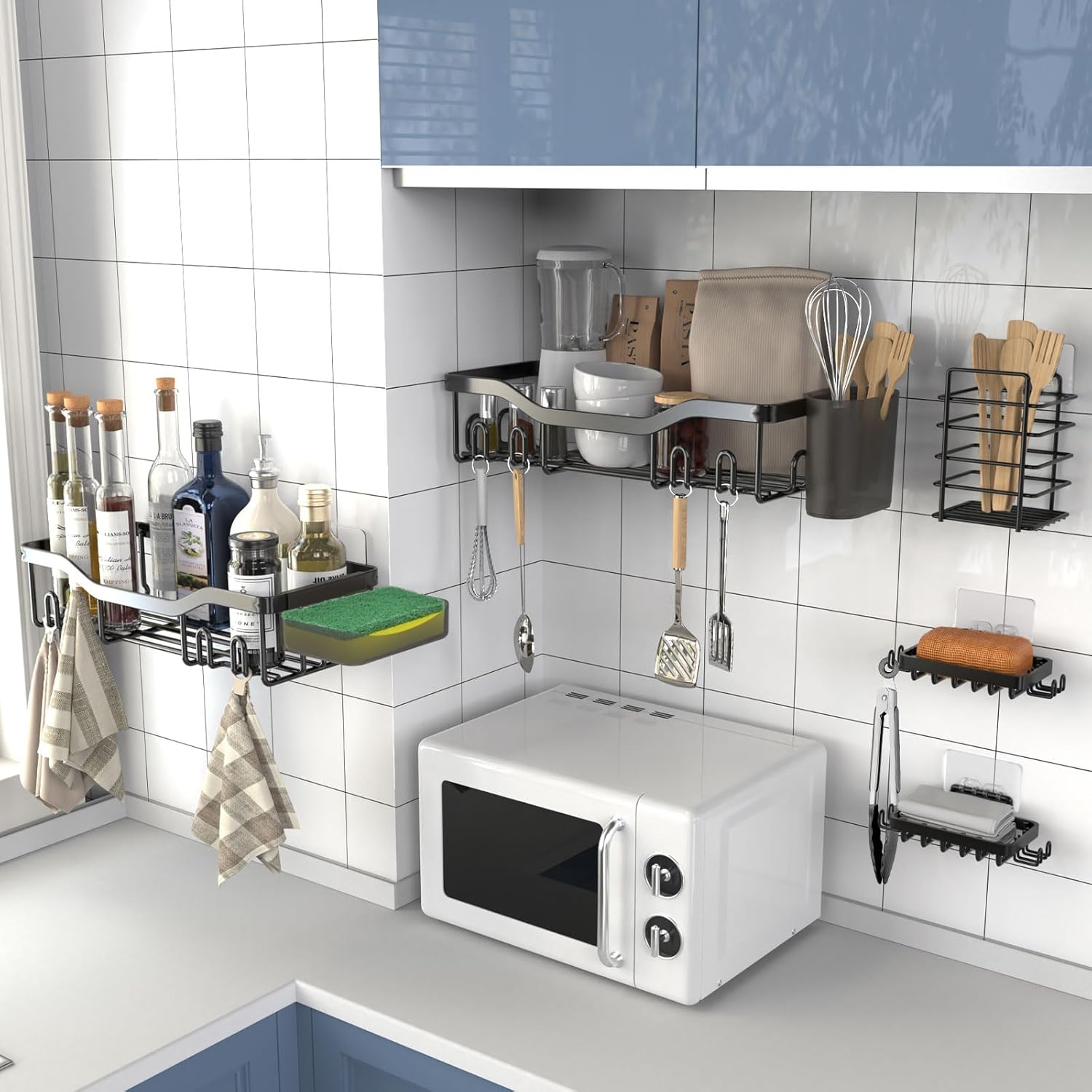 - Ultra Size Large Capacity Shower Caddies 7-Pack with 24 Hooks: Each extra-large shower shelf comes with 8 durable hooks, it's perfect for storing bathroom essentials, wash supplies, cooking utensils, seasonings, hats. Maximize your space with these roomy adhesive shelves, perfect for enhancing your toilet, bathroom, kitchen, RV, laundry space or tool room, no drilling needed. Consider this bathroom organizers and storage set as a thoughtful gift for family and friends