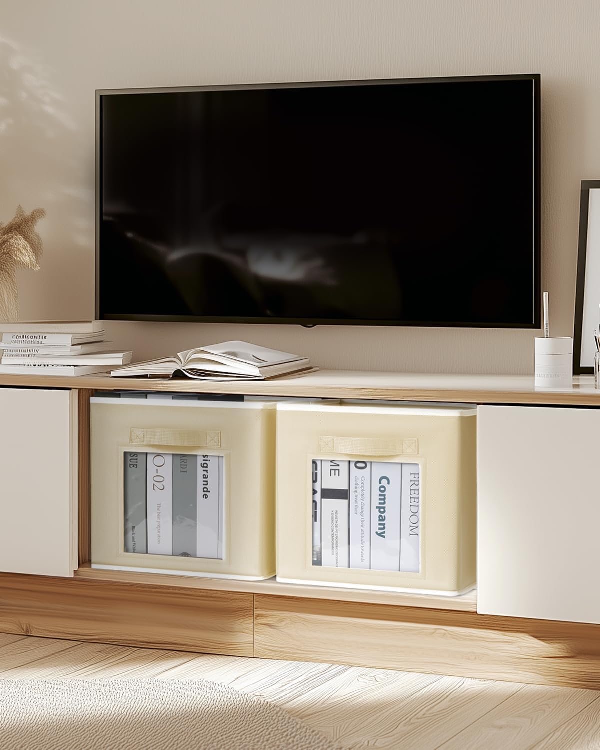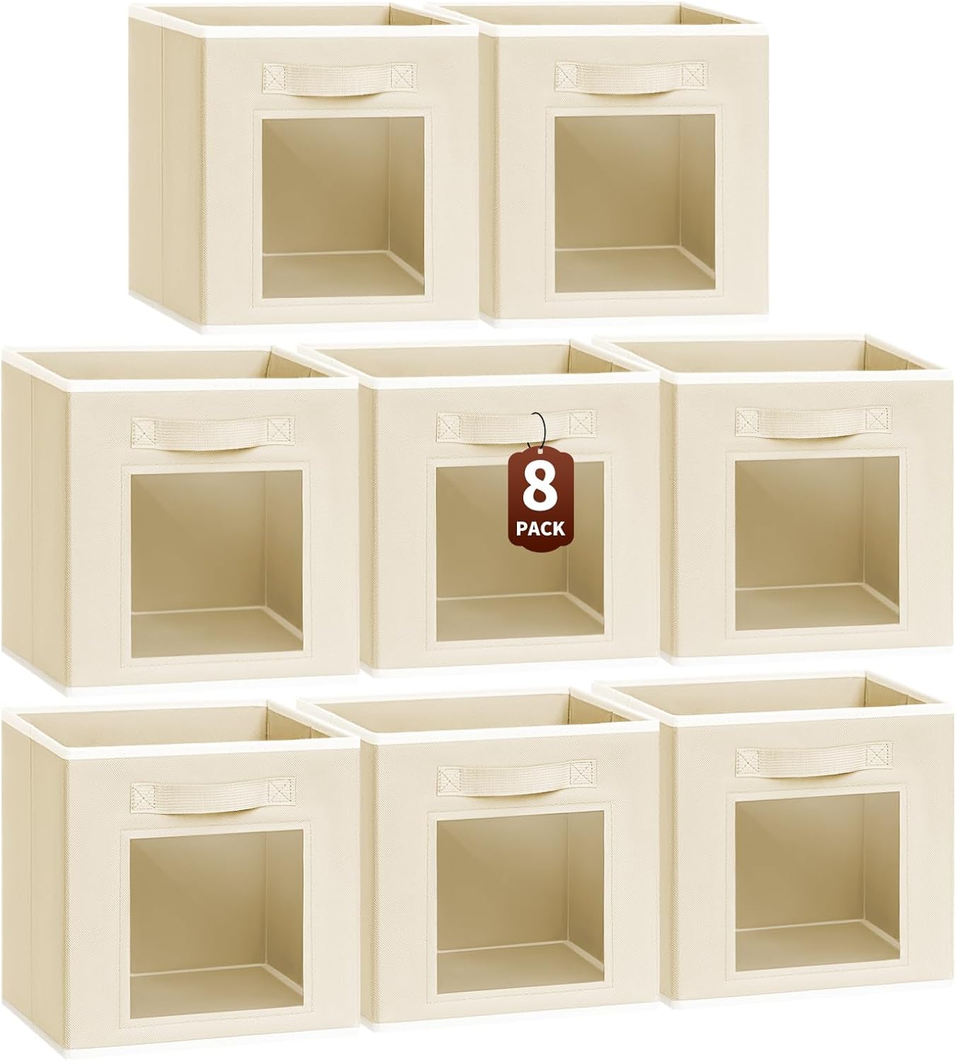 Foldable Storage Cubes - Cubby Storage Organizer with Window, Decorative Baskets for Organizing, Fabric Bins for Clothes Storage, Closet Storage Cubes-11inch, Set of 8, Beige