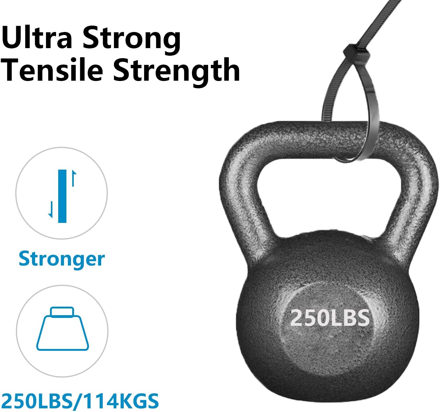 - 【Heavy Duty Zip Tie】 Zip Ties with 250 lbs are 0.48 inches / 12mm, it is longer, wider and stronger than ordinary zip ties. The wide design makes the large zip ties stronger, suitable for hanging fences, securing tubing insulation, cable management, decorations and supporting plants.