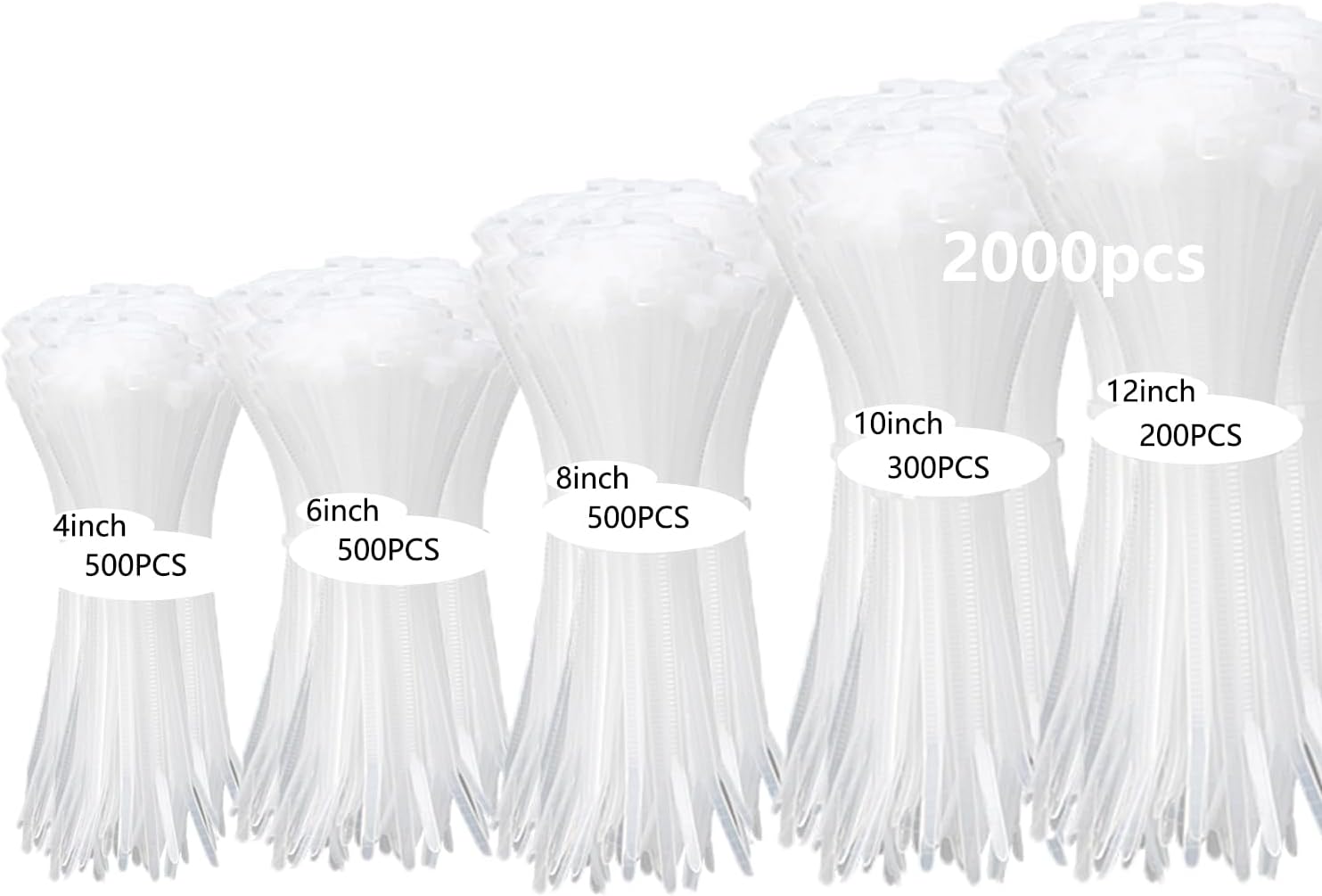 2000 PCS Zip Ties Assorted Sizes 4+6+8+10+12 Inch Self-locking Nylon Cable ties Heavy Duty Outdoor, UV Resistant Wire Straps for Home Office Garden Workshop Indoor Outdoor Fence((White)