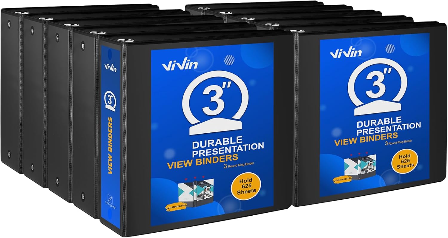 ViVin 3 Ring Binder 3 inch with Clear View Cover, Large 3" Round Ring for Strength, Holds 600 Sheets of US Letter Size Paper, Office Home School, 10 Pack (Black)