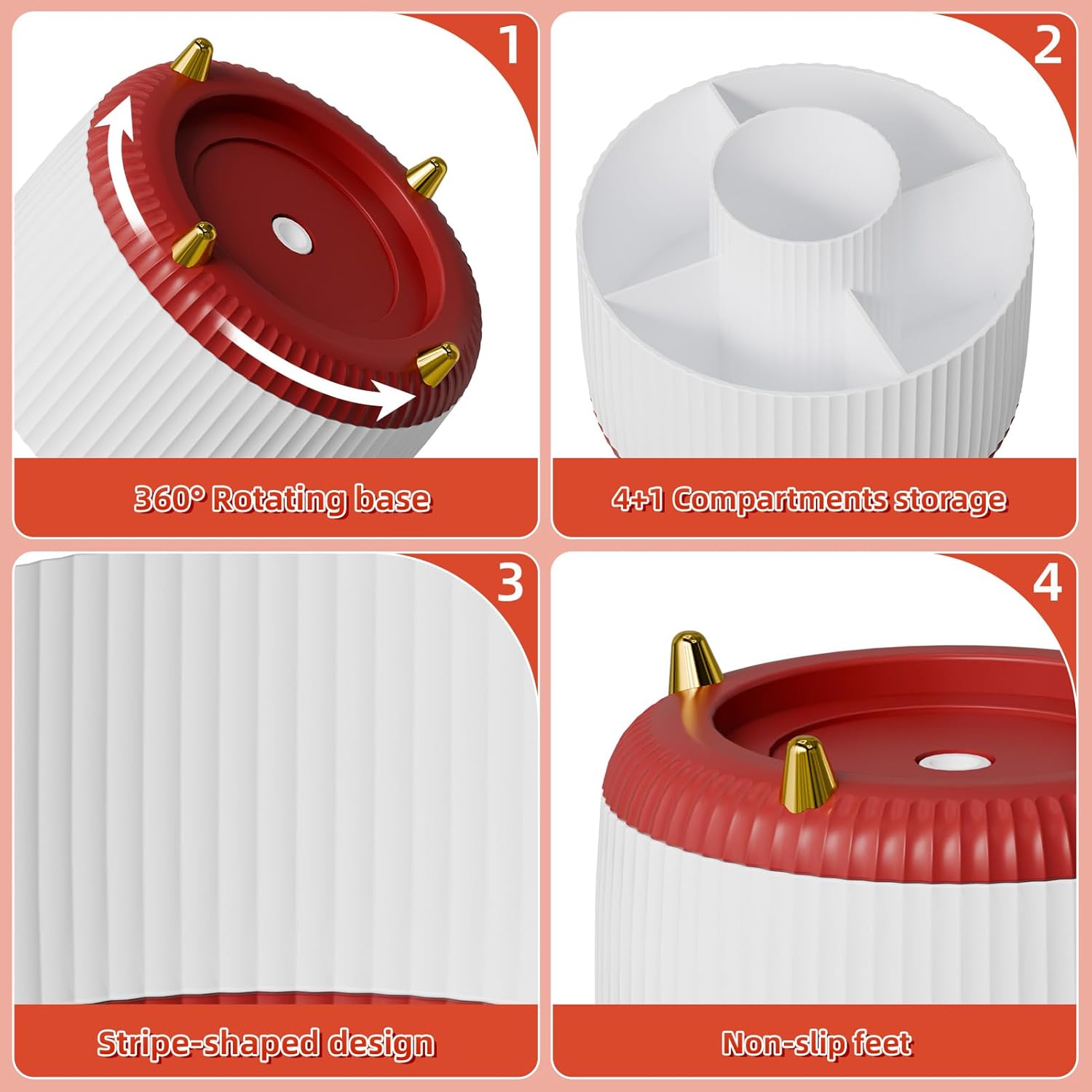 Marbrasse Desk Organizer, 360-Degree Rotating Pen Holder, Desk Organizers and Accessories with 5 Compartments Pencil Holder, Art Supply Storage Box Caddy for Office, Home (White+Red)