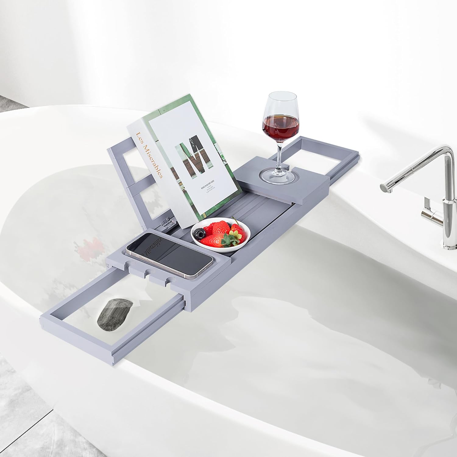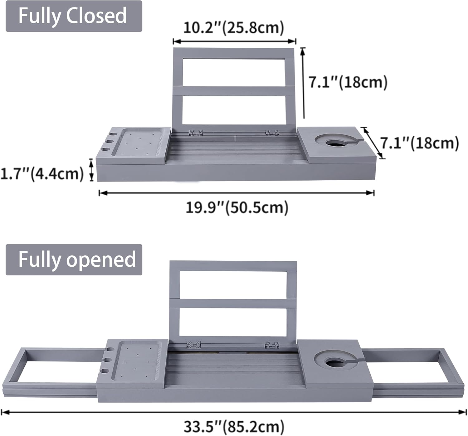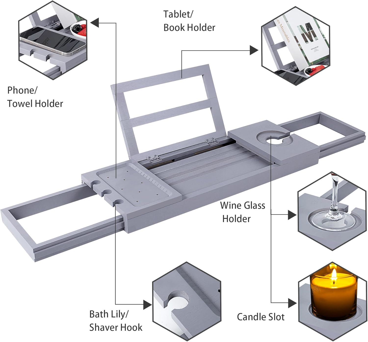 Utoplike Bathtub Tray Caddy Bamboo, Grey Bath Table for Tub Adjustable, Bathroom Organizer with Book Tablet Wine Glass Cup Towel Holder
