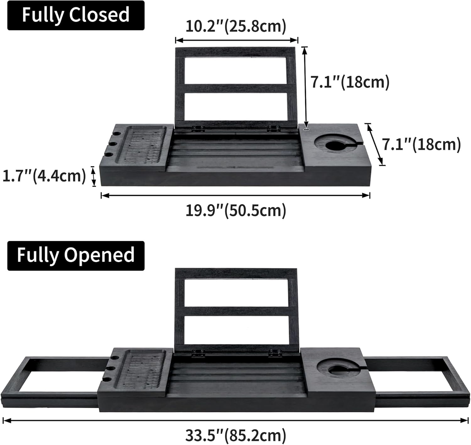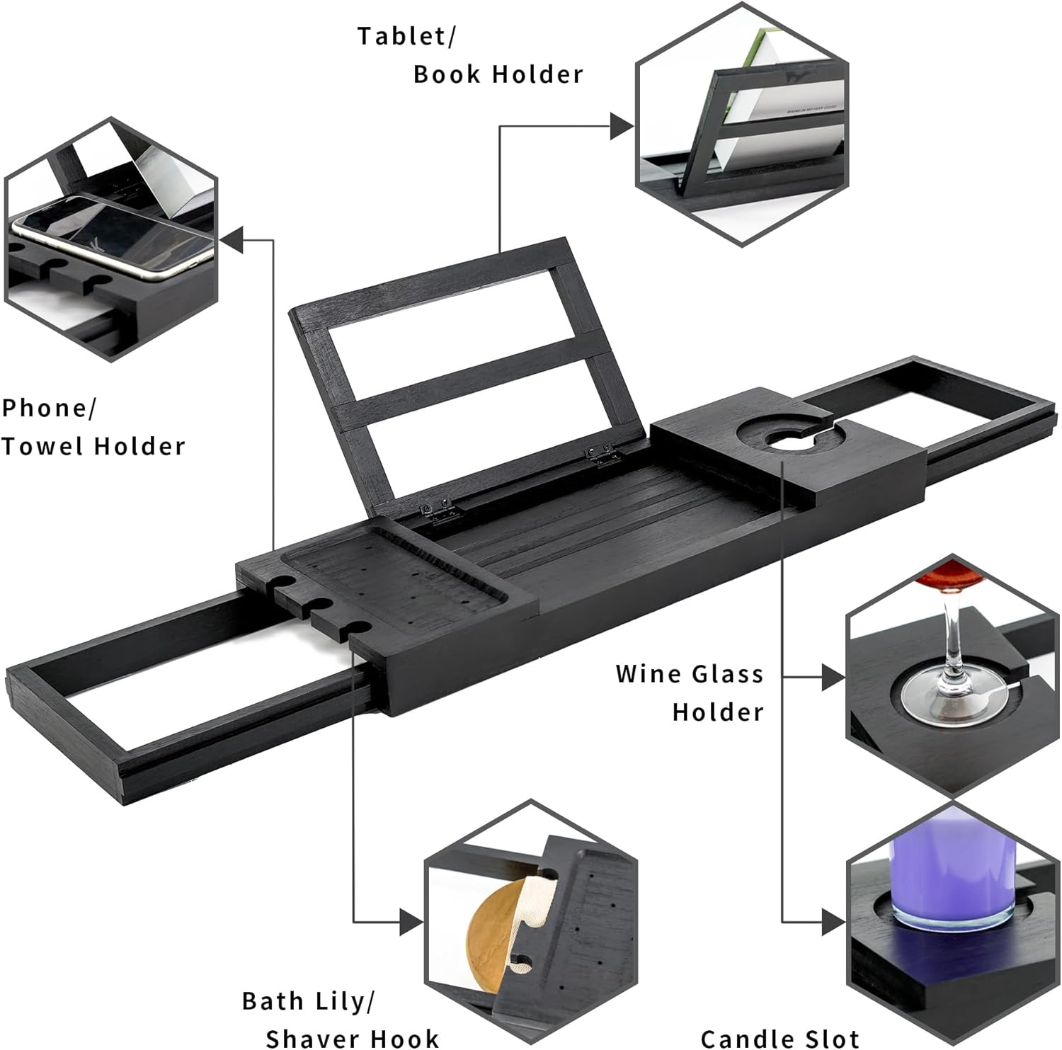 Utoplike Bamboo Bathtub Tray Black, Adjustable Bath Caddy Table for Tub, Bathroom Organizer with Book Tablet Wine Glass Cup Towel Holder