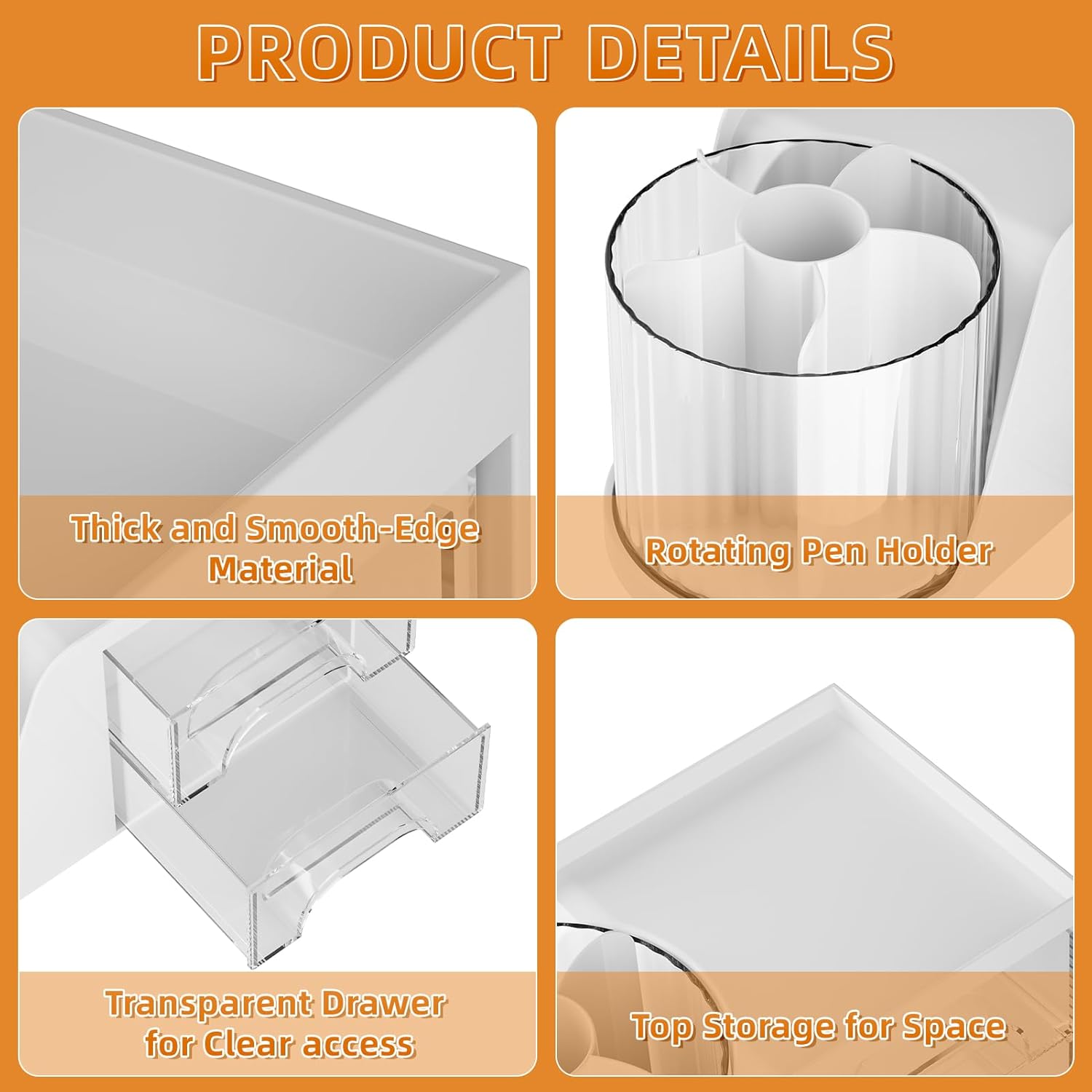 - 【Unique Design】: This desktop organizer is an all-in-one design blent rotating pen holder and drawer organizer. This gives it a more functional storage performance which is convenient for storing and organizing small items on office desks, at home, on vanity, and so on, helping you to save space, and make your desk look more neat and clean.