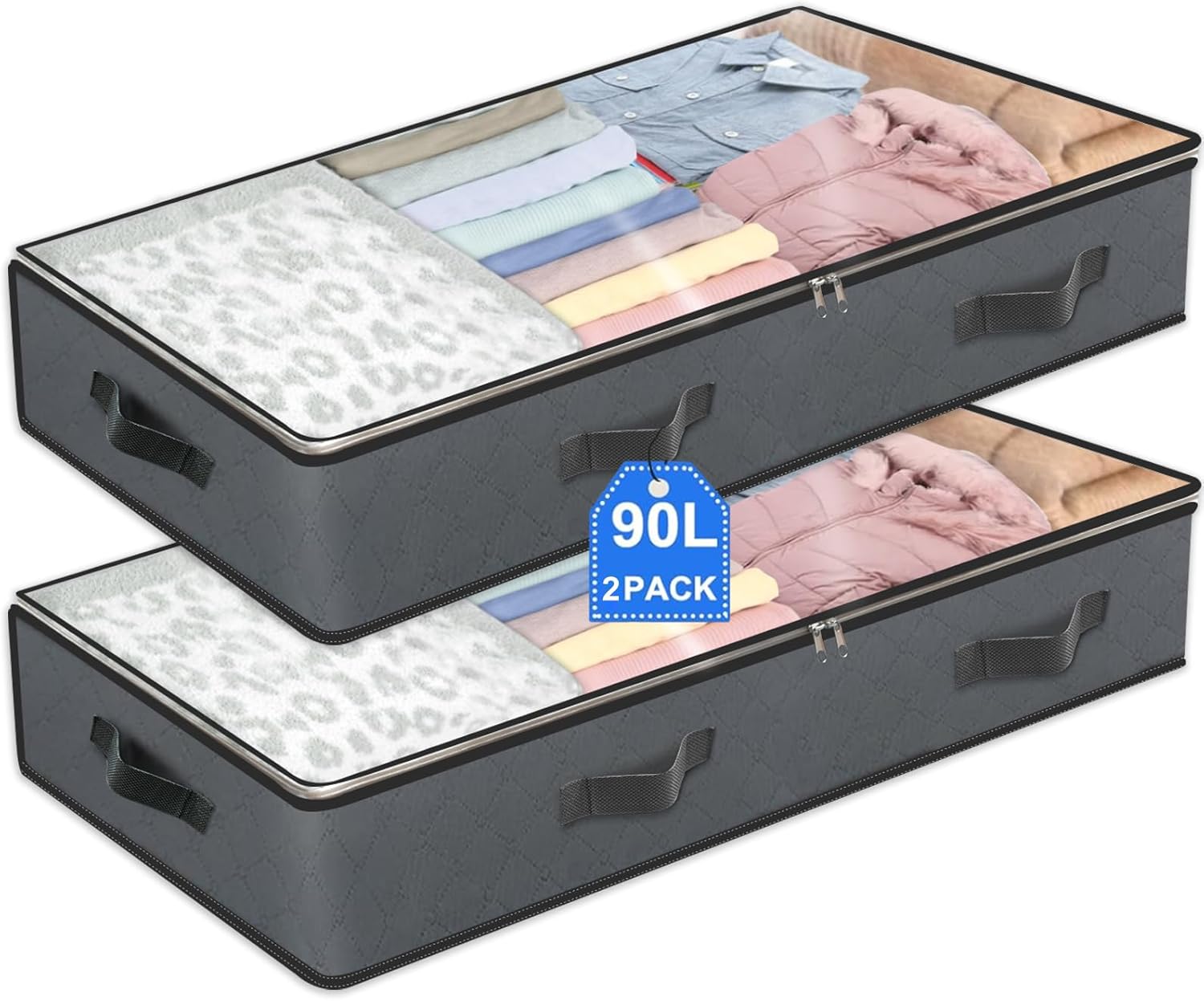 2 Pack Under Bed Storage, 90L Collapsible Closet Containers Organizers and Under Bed Storage Bins, Underbed Storage Bags for Wrapping Paper, Blanket, Towels, Clothes, Comforter, Sweaters, Linen Sheets