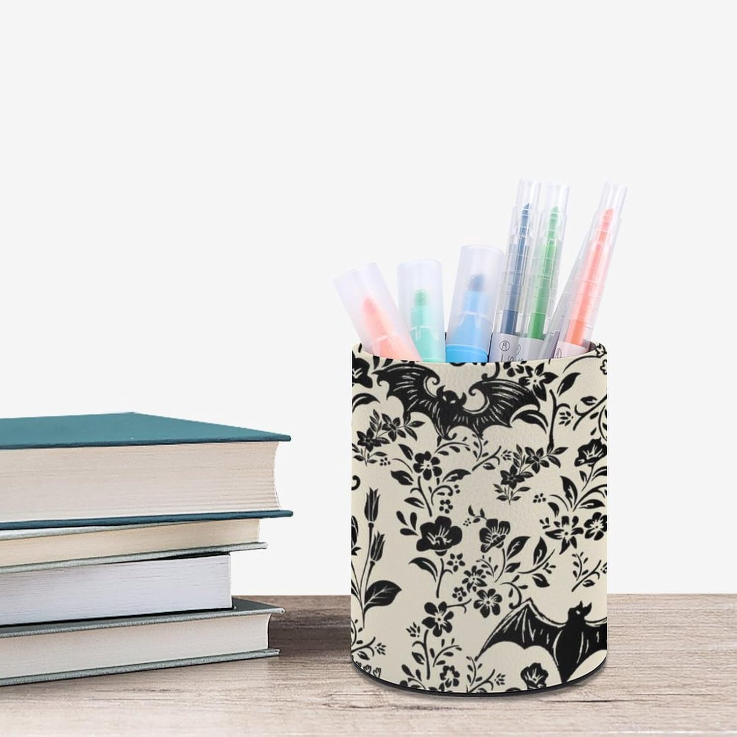 Gothic Bat Flowers Pen Holder Pencil Organizer Cute Pencil Cup Desk Decor Makeup Brush Holder PU Multifunctional Office Suppliesfor Home Classroom School