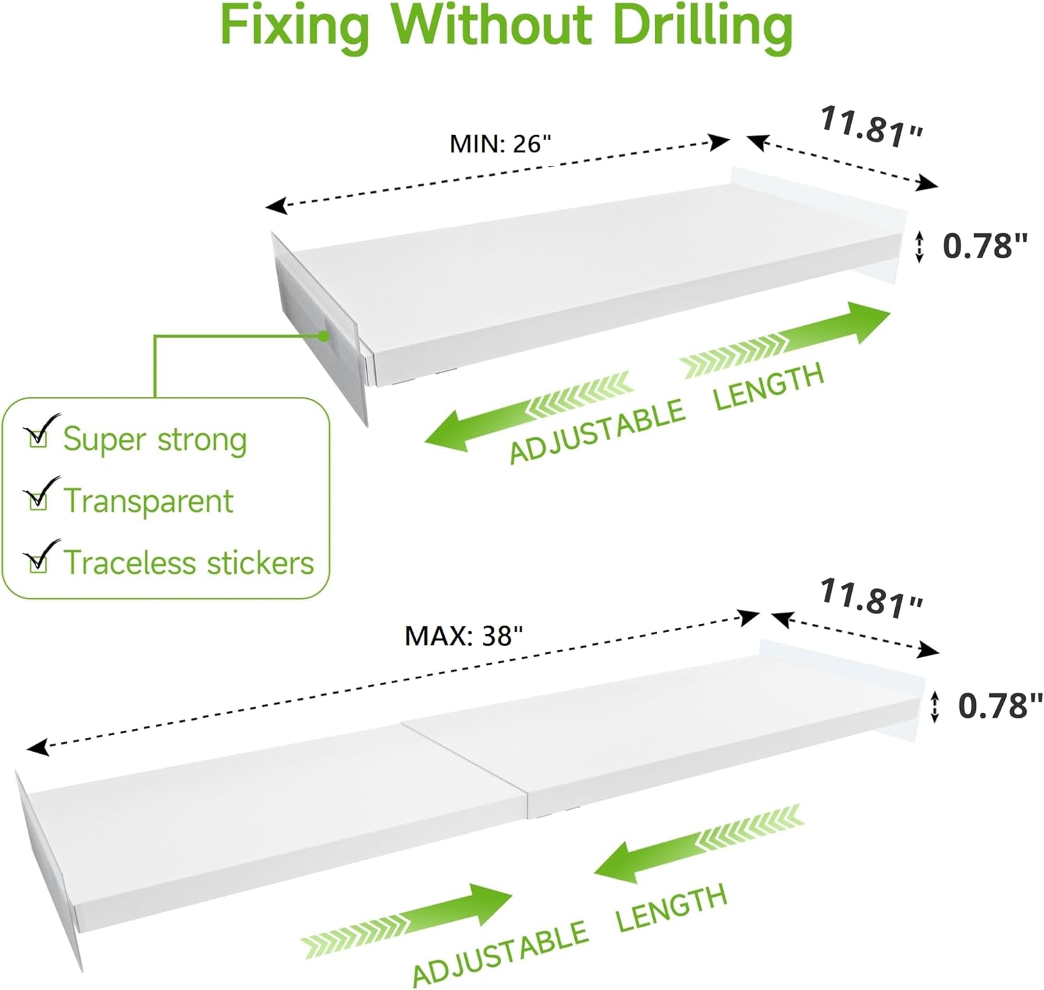 - Expandable Design: This pantry shelf adopts a metal sheet structure with adjustable length from 26 inches to 38 inches. Available width is 11.81 inches. Please note that the length of your closet should be within 31 inches. Please confirm the size you need before purchasing.