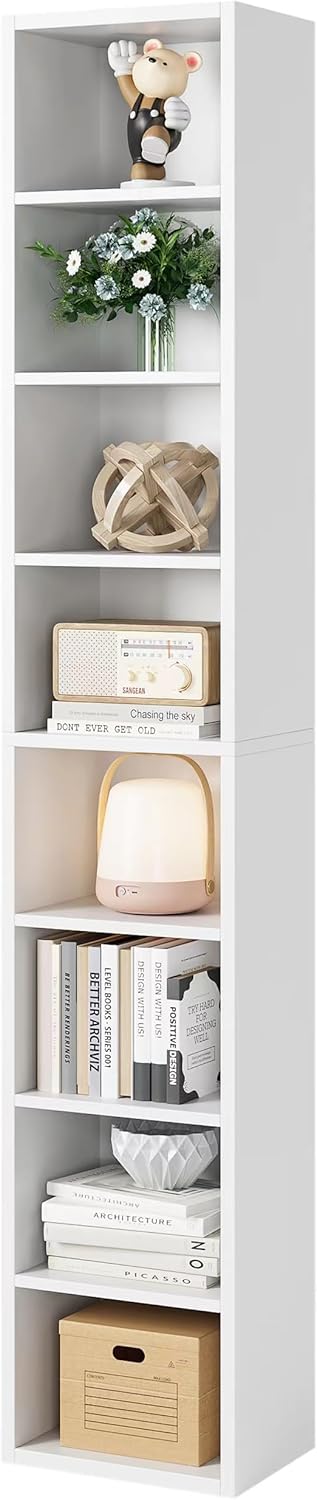 - 【Narrow Shelf for Small Space】The 8 Tier narrow bookshelf is designed specially for tight space like entryways/living room/bedrooms’ corners. With its clean lines, practical functions and large capacity, the skinny bookcase deserves your purchase.
