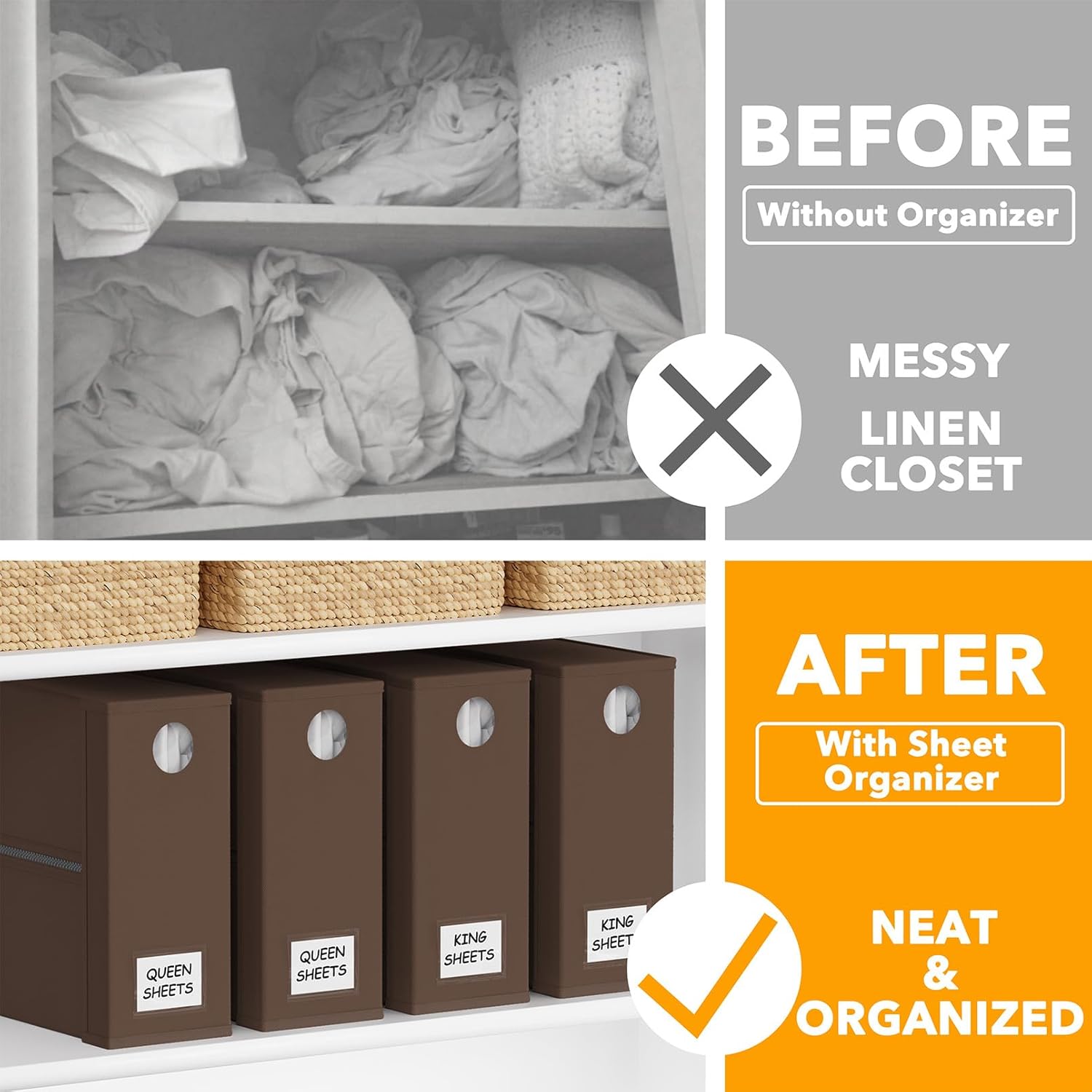 - BROWN SHEET ORGANIZERS 4 PACK - Make your linen closet organized and beautiful with this foldable bed sheet fabric organizer; Each Storage Organizer SIZE: 5"W x 15"D x 12.8"H