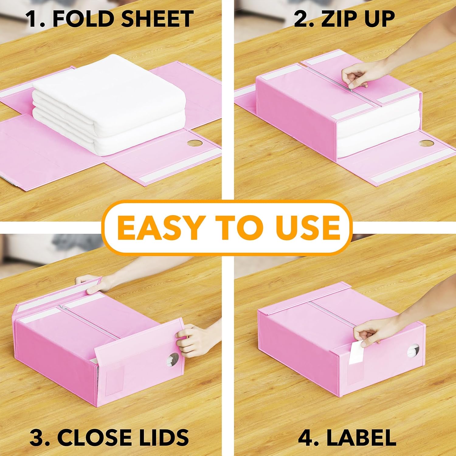 - EASY TO FOLD AND USE - Each foldable bedding sheet set organizer is super easy to use; You can fold your sheets first and put them in the center, then zip, close, label and finish