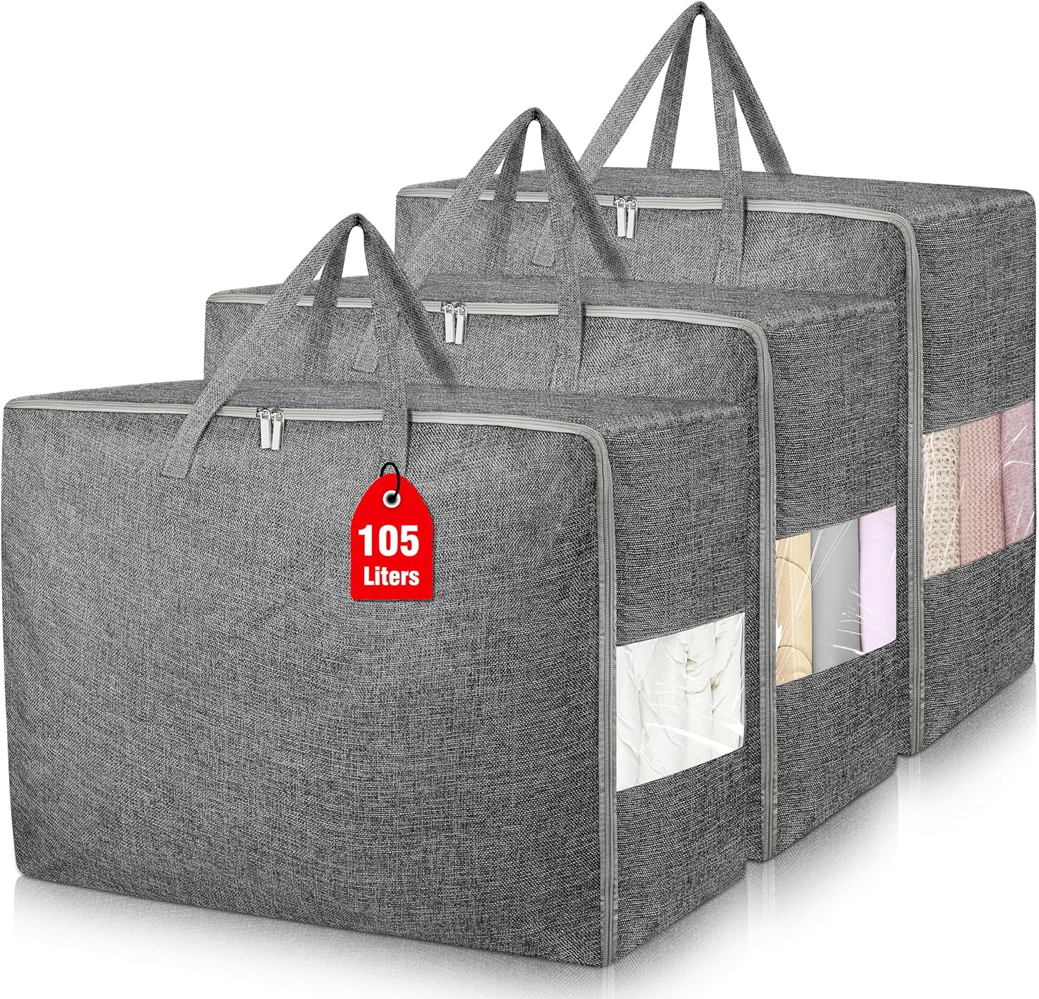 3Pack 105L Extra Large Storage Bags, Folding Comforter Blanket Storage Bags Closet Organizers and Storage Containers for Clothes with Strong Handles&Zippers Clear Window for Bedding Pillow Black