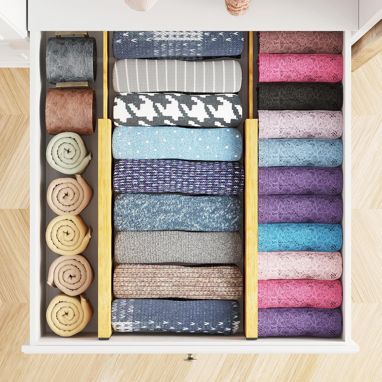 SpaceAid Bamboo 4 Pack Dresser Drawer Dividers, 4.65“ High Adjustable 12.5“-17” Drawer Organizers, Expandable Organization for Clothing, Clothes, Dressers, Natural