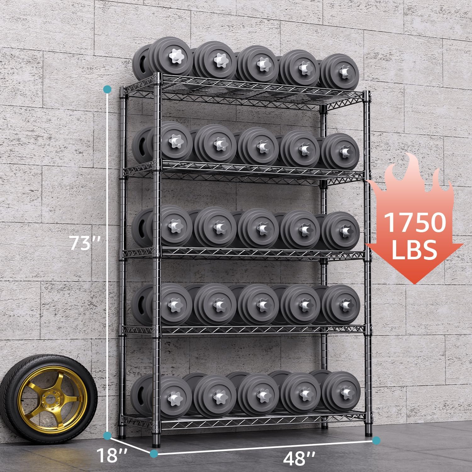 - 【STABLE AND DURABLE】Crafted from premium Carbon Steel and reinforced with 22.22mm pipes, this wire shelving unit (17.7"D x 47.2"W x 72.3"H ) ensures stability. Each shelf showcases a weight-bearing capacity of 350 pounds, while the entire unit can support up to 1750 pounds.