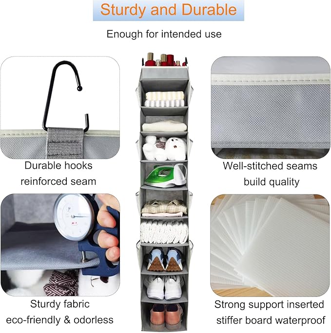 - 【Durable and Sturdy】Roomtalk 10 secion hanging shoe shelves is designated more durable than others, comes with 2 stable hooks system to hang up weights comparatively about 22 Lbs perfectly, heavy duty fabric eco-friendly , breathable, smell-less, covered inserted with stiffer bottom strong support on each cubby without floppy or tilt.