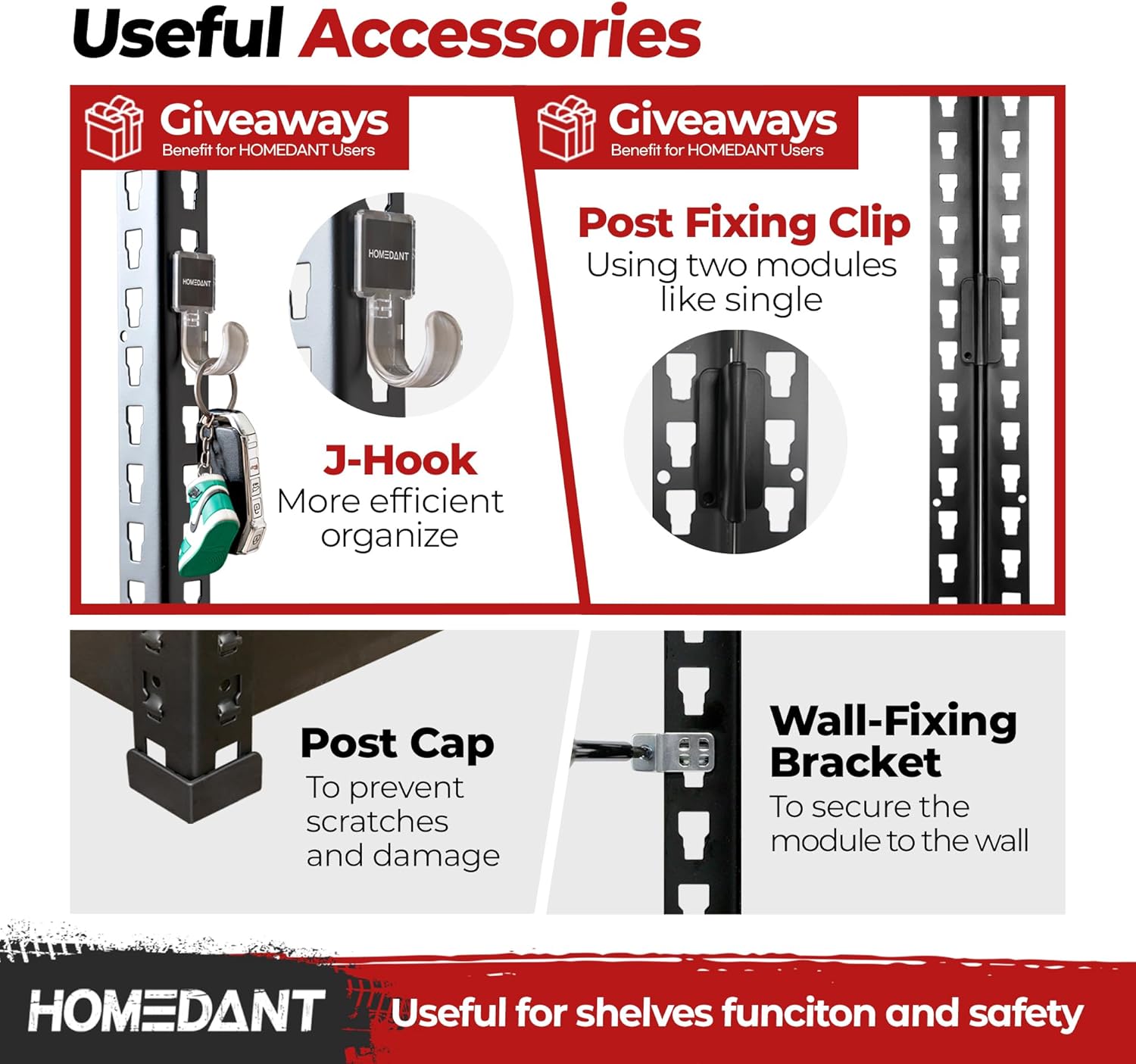 - EASY TO ASSEMBLE & HEIGHT ADJUSTABLE - You don't need any parts as plastic clips like wire shelving. You just slide and fix the frame in the post hole (a Mallet is a giveaway). Once it is put together, it can create a great deal of additional storage space without taking up too much space. Each tier can be freely adjusted the shelf up and down by the size of the item, as the hidden secret holes inside the post have grooves 1.18 inches apart. So can create customized storage space.