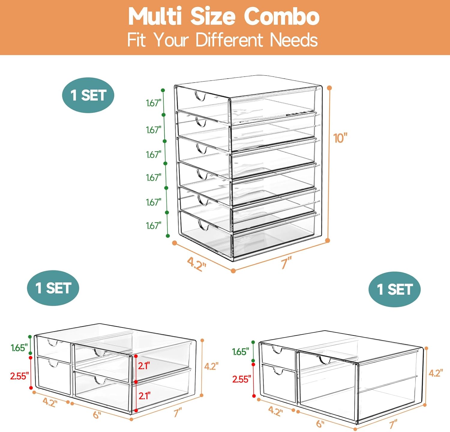 - 👍3 Set Desk Organizers with 13 Drawers - This acrylic drawer storage organizer organized neatly and maximize space utilization on shelves, dressers, vanity table, and bathroom counters. It’s perfect to organize all your messy items into sections. You can also put your small objects on top of acrylic bins to make your countertop space more tidy. And 3-pack drawer organizers are also enough for you to place in multiple places