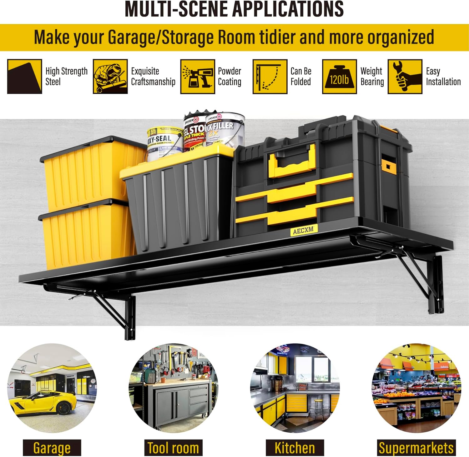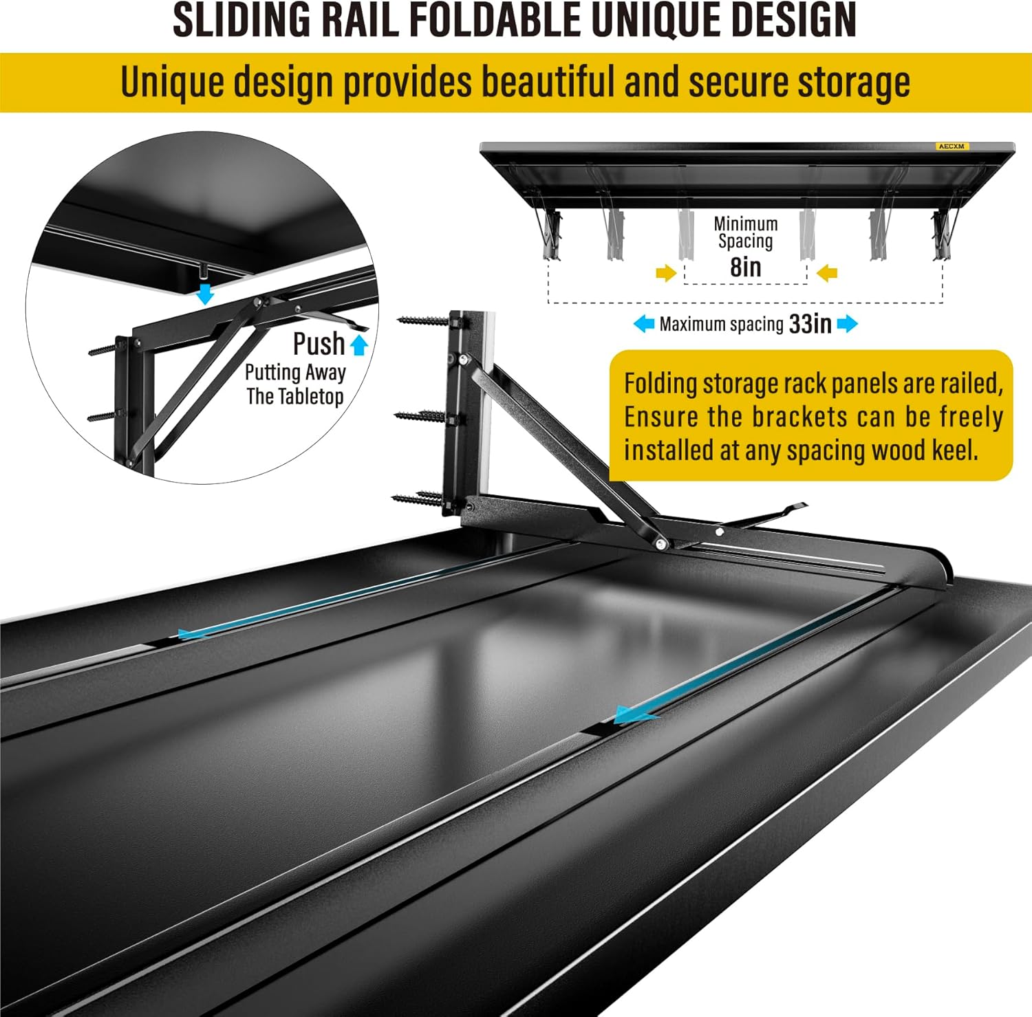 - SUPERIOR DESIGN: The foldable garage storage shelf panel is made of whole steel plate, The surface of matte high temperature powder baking paint, Flat and smooth, Panel with sliding rail design, The bracket can be installed freely in the range of 8"-33" spacing of wood wall keel, And at the same time it adopts folding bracket, Which can be freely stowed away or unfolded