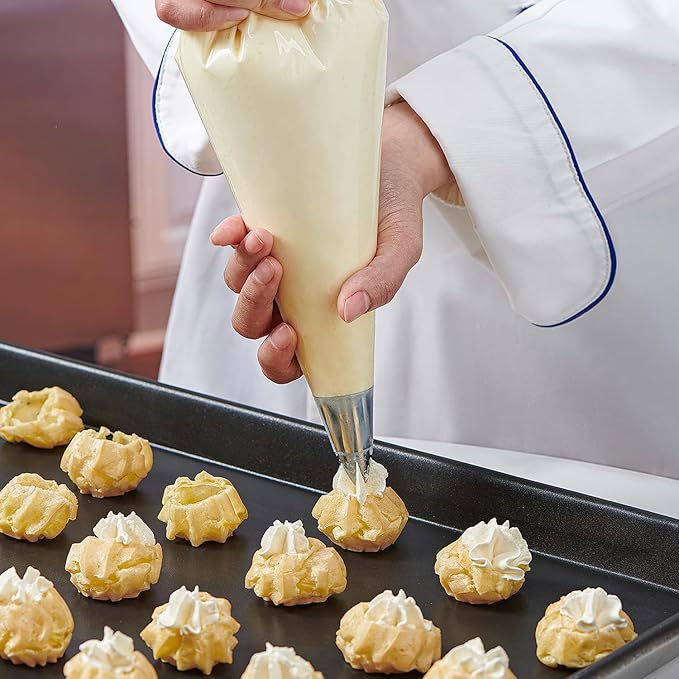 - These pastry bags are perfect for piping buttercream, royal icing, choux pastry and fresh cream to decorate cakes, cookies, cupcakes and other iced desserts with or without a tip. The bag capacity is ideal for large jobs like decorating toppings on a good number of cupcakes or decorations onto a large surface area without having to refill the bag.