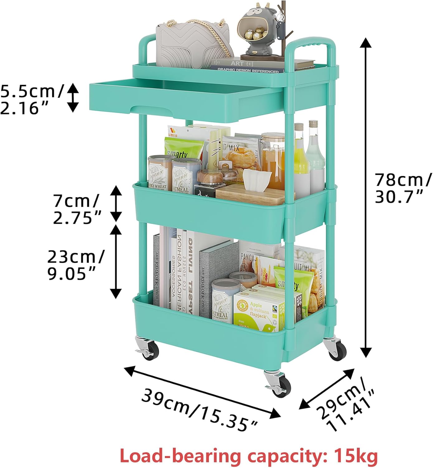 Calmootey 3-Tier Rolling Utility Cart with Drawer,Multifunctional Storage Organizer with Plastic Shelf & Metal Wheel,Storage Cart for Kitchen,Bathroom,Living Room,Office,Green