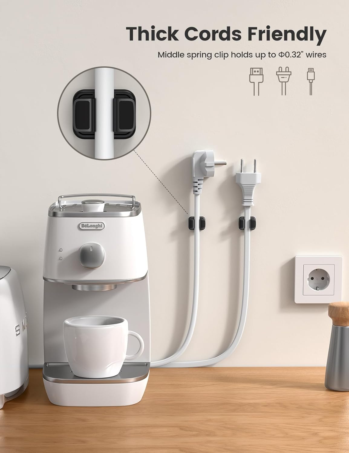 - Thoughtful Wide Compatibility: The extension length of the middle spring clip is 2.5-8mm (0.1-0.32inch), this desk cord holder spring clip can be applied to almost all the household cables, including iPhone charger cables, USB cords, HDMI thick cables,computer power cords, ethernet cable, etc. The both sides hole holder supply to the small cable which diameter is 3mm-5mm