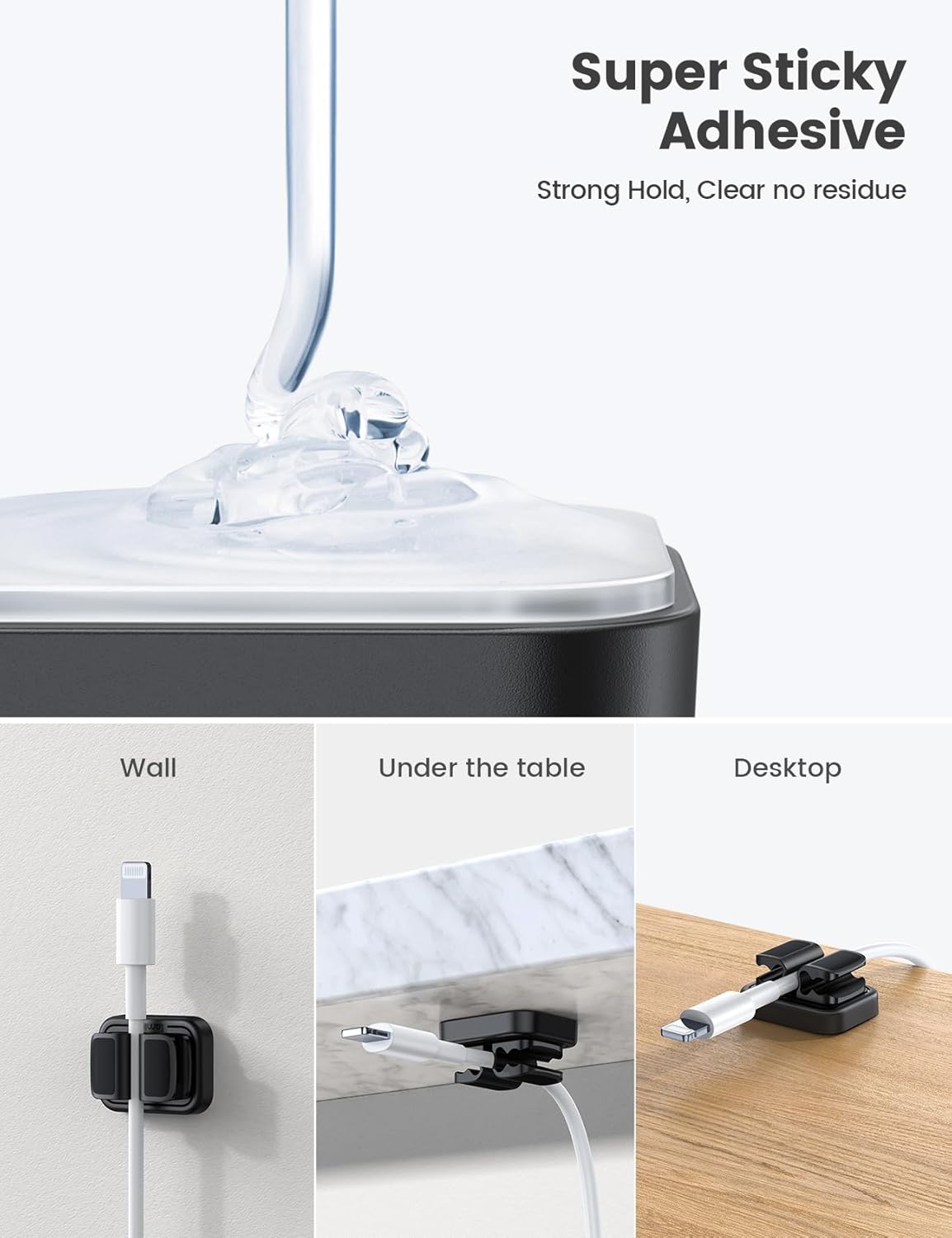 - Sturdy Acrylic Adhesive Pad: This cable management featured with a strong Acrylic adhesive pad tape that can sturdily adhere to any clean surfaces and hold various wire cords stably. Also the stickers can be clearly removed and replaced, allowing to easily change the clip location without residue adhesive or damage on desk, wall, nightstand, car, office, etc