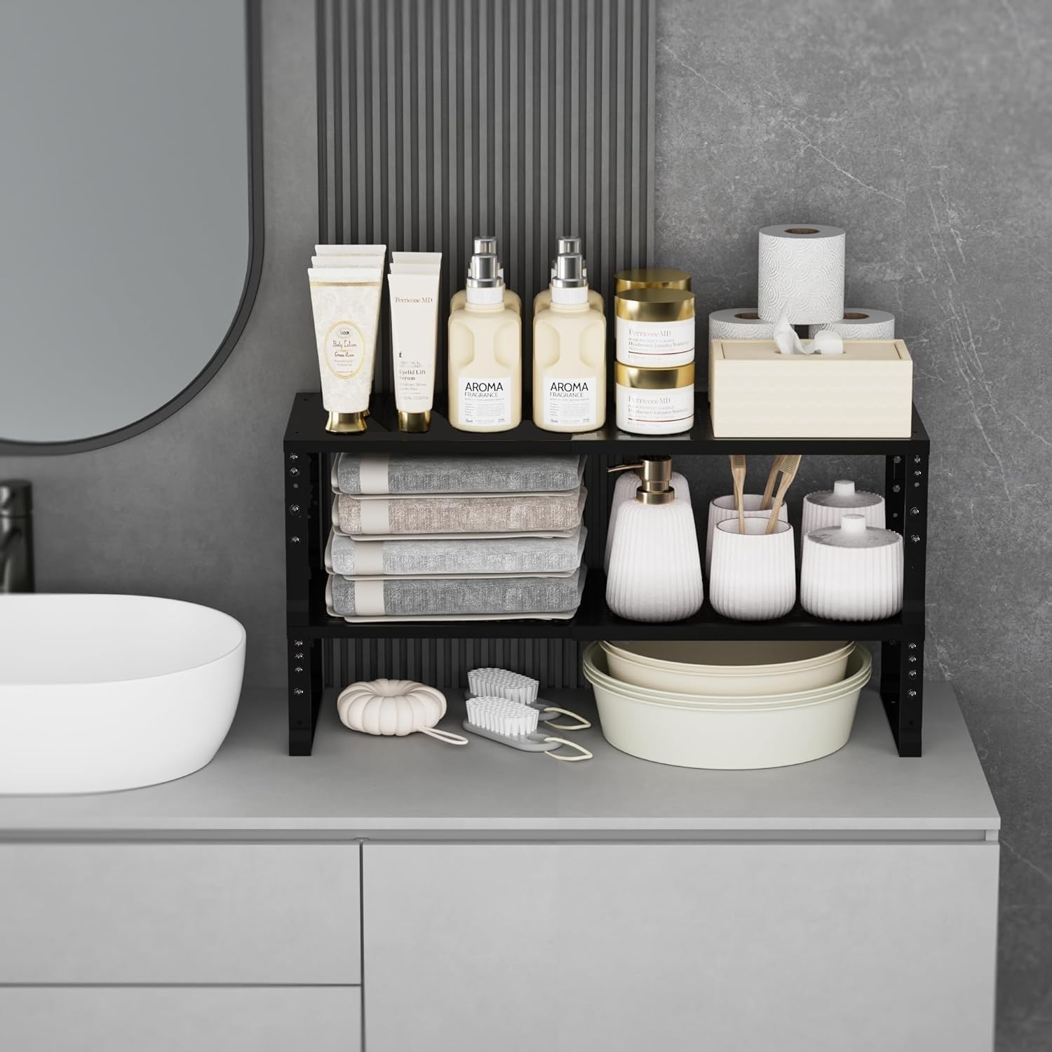 - ⭐【Expandable Size】Expandable length (10.04"D x 16.54"~26.38"W x 6.22~7.48"H).The extendable&stackable function used as kitchen cabinet shelf or expandable counter shelf organizer.It can function as a single or be separated into two/three racks, offers a tidy solution for your kitchen.