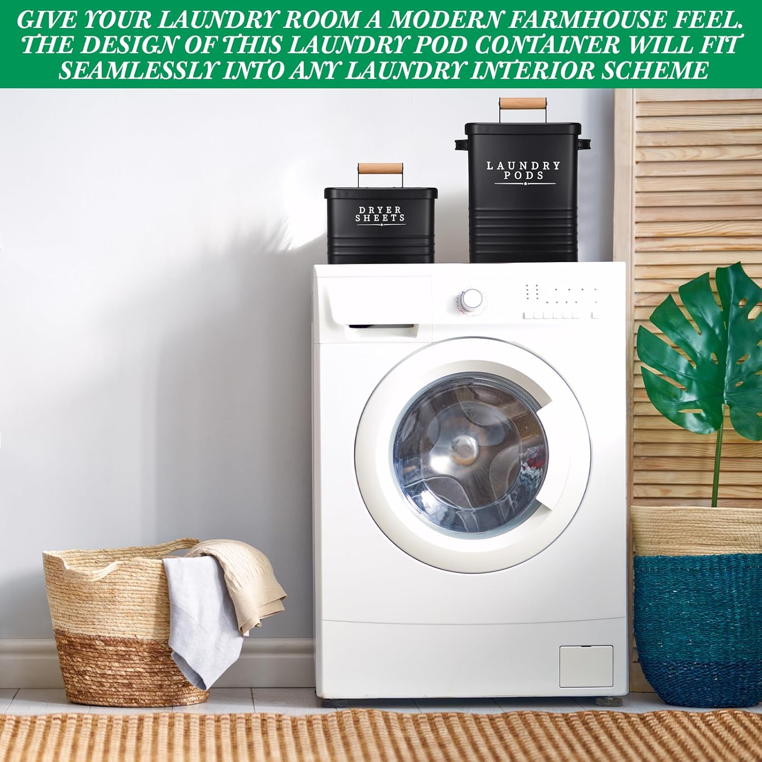 2 Pcs Laundry Pod Container with Dryer Sheet Holder Farmhouse Laundry Room Decor Organization and Storage Detergent Container Box with Lid Handle Metal Dryer Sheet Dispenser(Black)