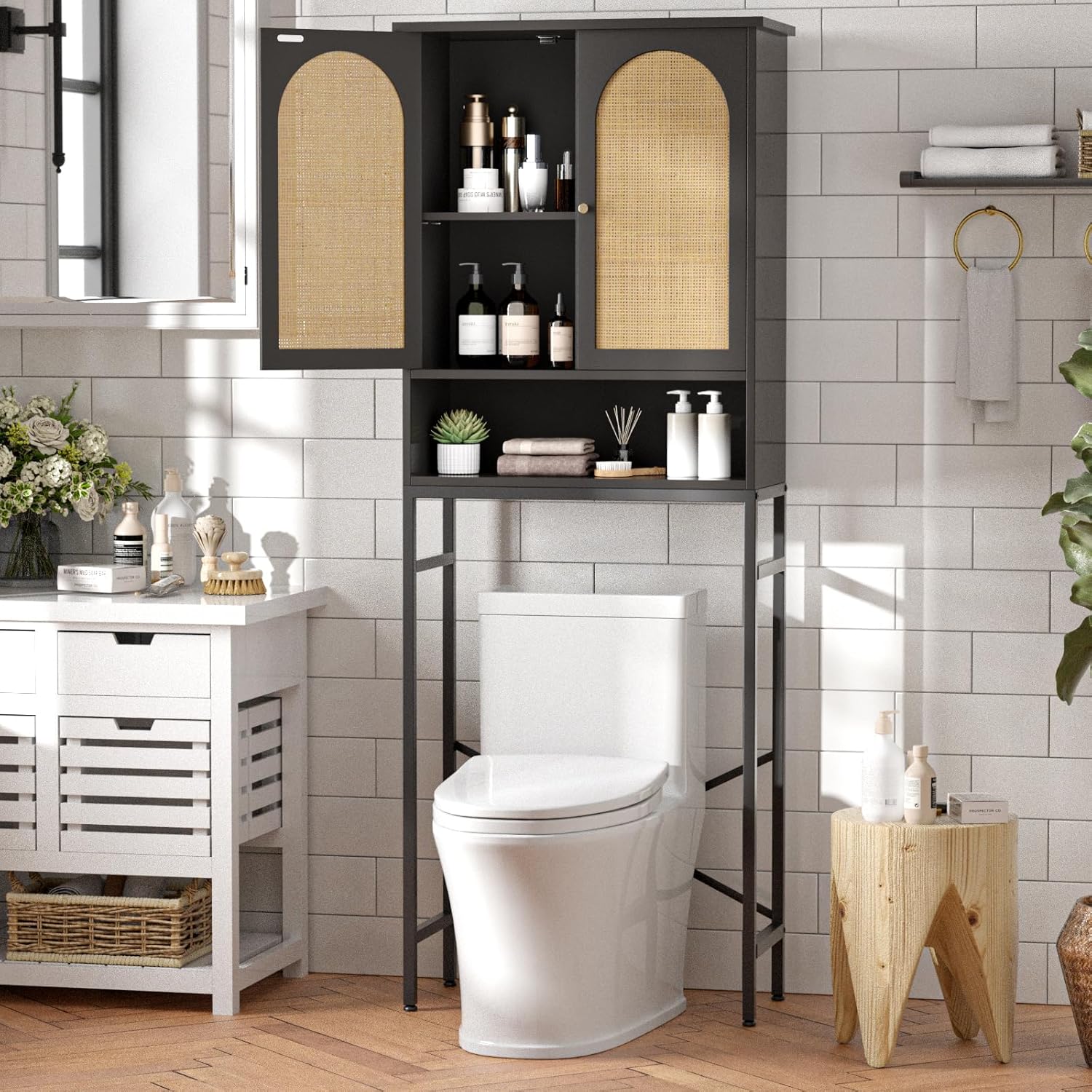- 【Space-Saving Over-the-Toilet Storage】 Fed up with a cluttered countertop and limited bathroom storage? Our over-the-toilet cabinet maximizes bathroom space utilization. Featuring wood grain board and rattan double doors, it keeps your accessories neatly stored and out of sight. Plus, the adjustable shelf allows for customizable storage options to meet your needs.