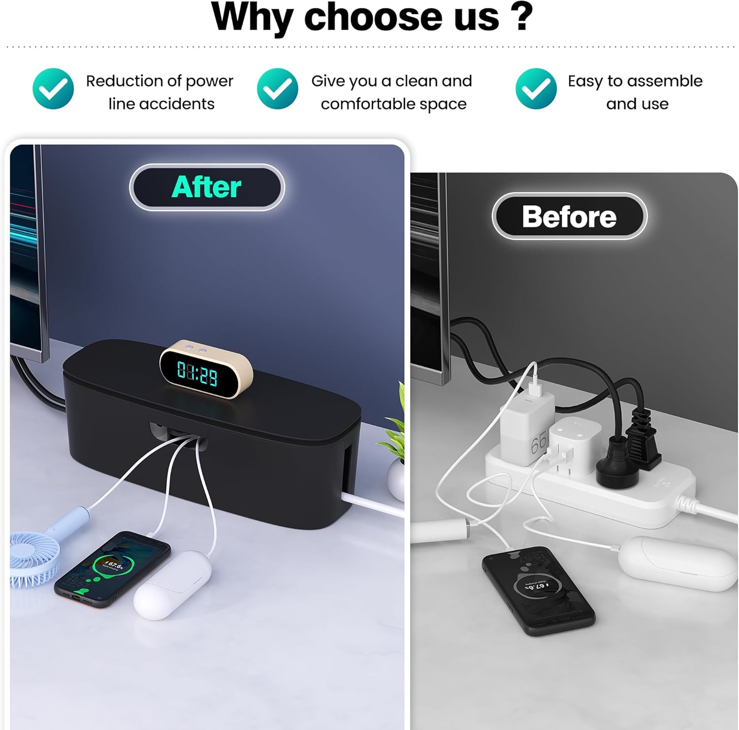 - [Baby Proofs Cable Organizer] Our charger organizer box prevents pets and babies from being electrocuted, as well as pets from chewing on cords and plugs. It allows children and pets to play around the house