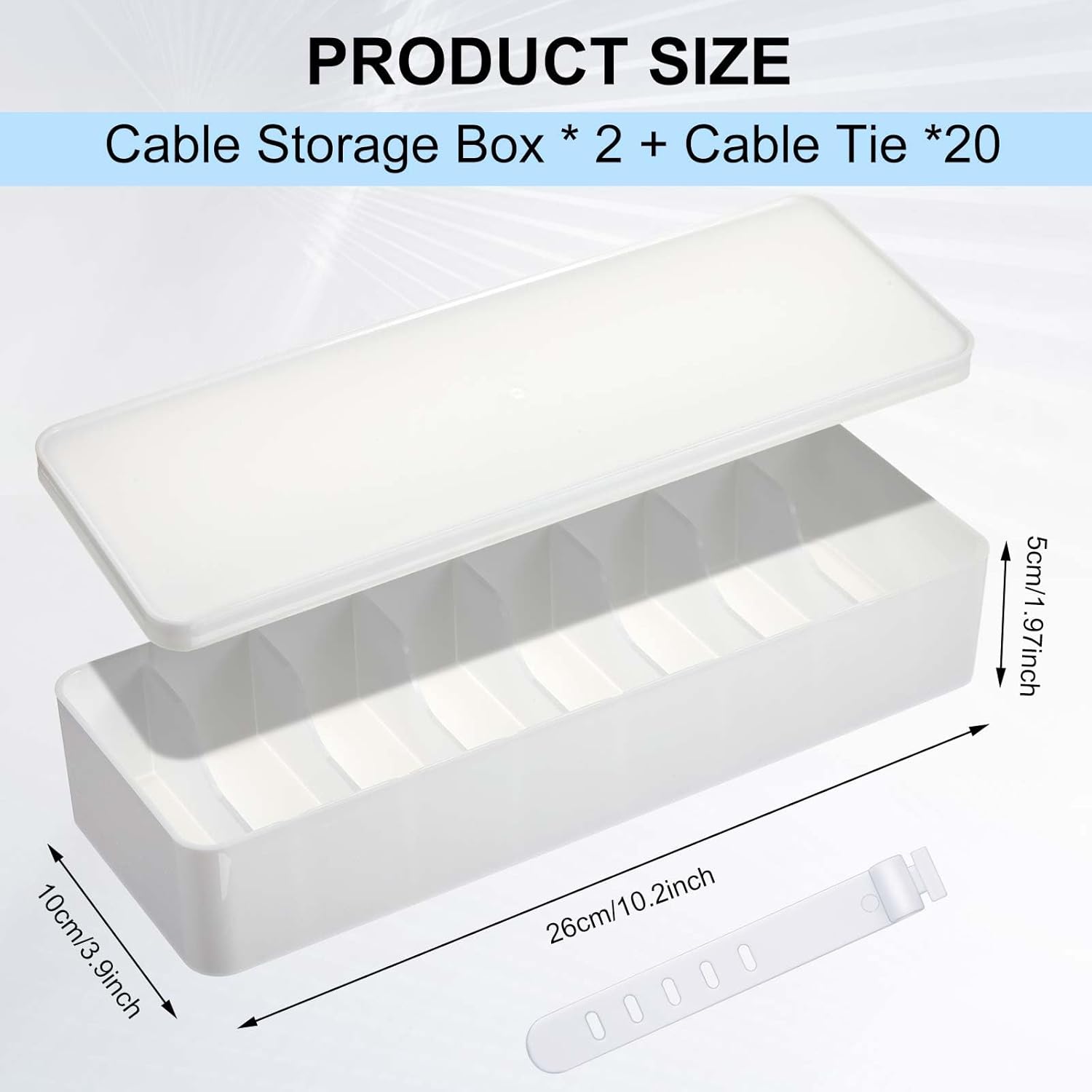 - Combo Package: you will receive 2 pcs cable storage organizers with lids (10.2 x 3.9 x 1.97inches/ 26 x 10 x 5cm) and 20 pcs silicone wire ties; Our cable management box kit is convenient and easy to clean and store small desk accessories, thus saving space and keeping desk tidy