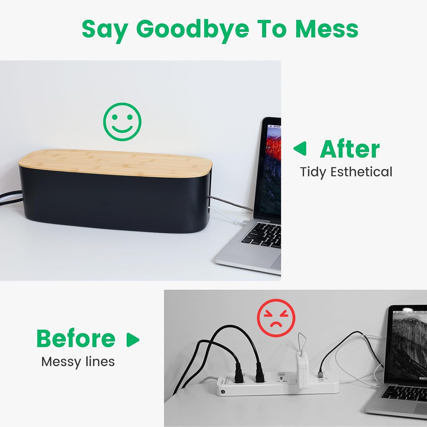 Large Cable Management Box - Cord Organize Box with Bamboo lid for Safe Home & Office, Cord Hider for Power Strip Under Desk, Cover TV Wires, Child & Pet Proof Cord Box, Black