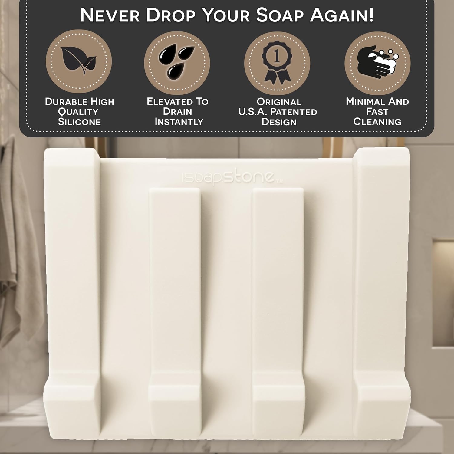- USA Patented Elevated Design - The original USA patented self draining waterfall design that will dry soap bars fast. No more mushy soap sitting in a pool of water. This 1-pack beige soap dish comes with a cute giftbox for the perfect stocking stuffer! Designed with several drain spouts for water to flow out quickly!